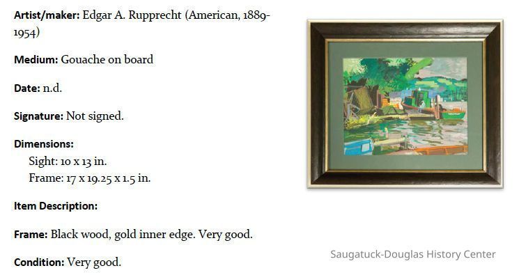 "In searching for paintings for the exhibit I visited Love Gallery in Chicago which had quite a number of Rupprechts available, including one of the downtown Saugatuck village square, but it was way out of our price range.