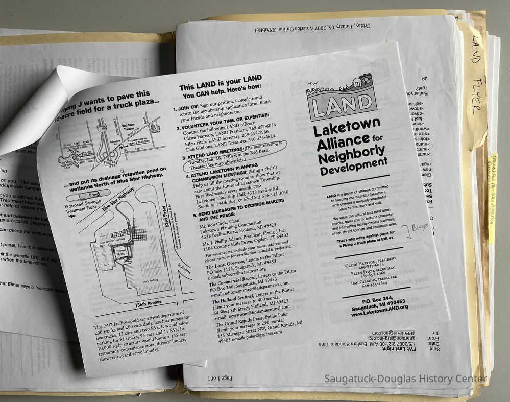 Documents, emails, press releases, media contact lists, and newspaper clippings pertaining to the formation and activities of LAND - The Laketown Alliance for Neighborly Development, a citizens group opposed to the development of a Flying J truck-stop at the I-196 exit 41. The well-organized documents track LAND's formation, strategies, membership and mailings lists from 2006 to 2007.Context
