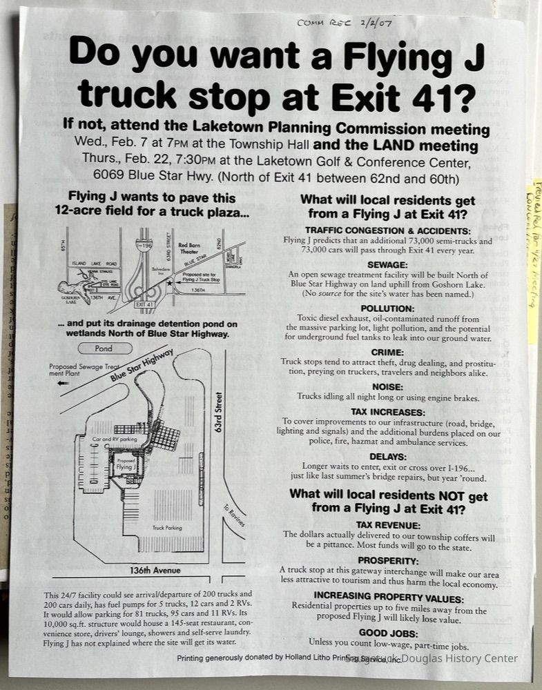 Example of citizens joining together to resist development. In the end, Flying J Inc. [headquartered in Ogden, Utah] abandoned its plans. The property in question, on the southwest corner of 63rd Street and the Blue Star Highway, is in Laketown Township but many residents of the Ravines in Saugatuck Township were concerned that their lifestyle and property values would be negatively impacted the development. LAND's officers were Glenn Hartson, Ellen Fitch and Dan Gibbons.Collection