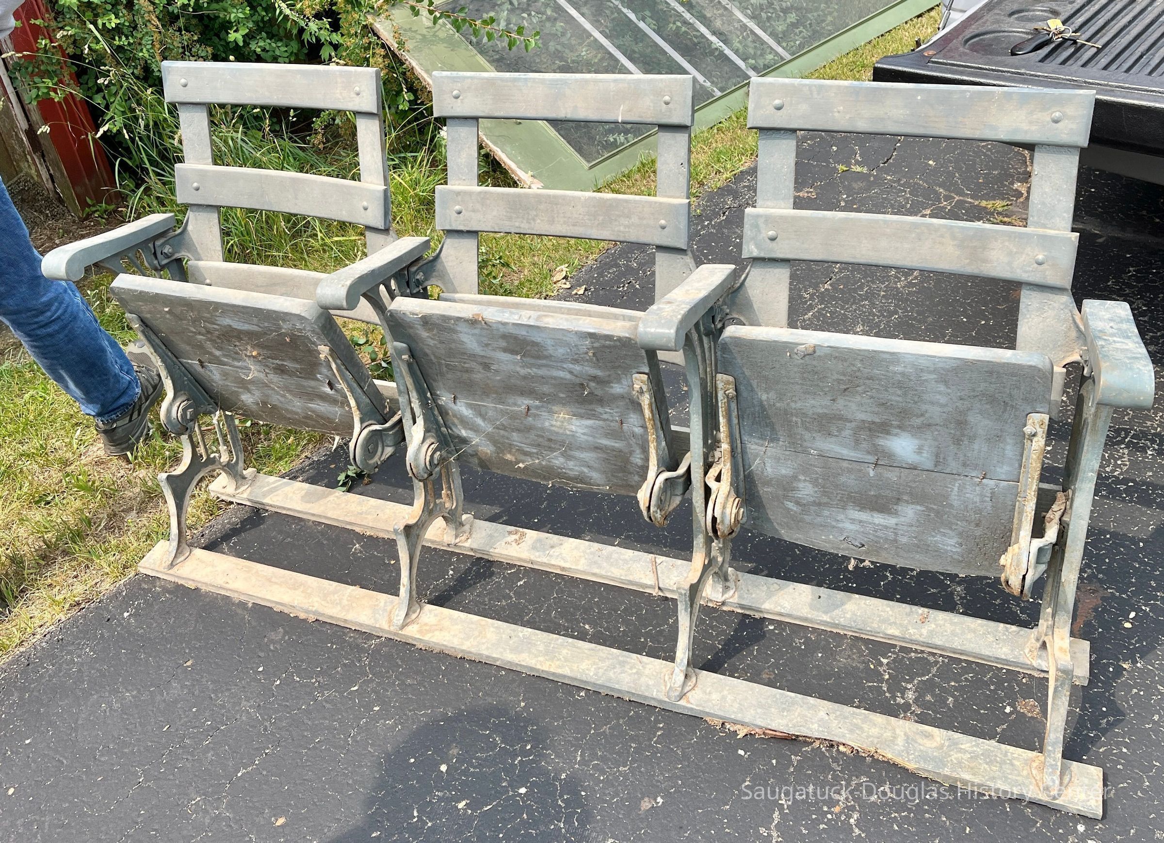 Set of four fold-down seats made of wood and metal.Collection