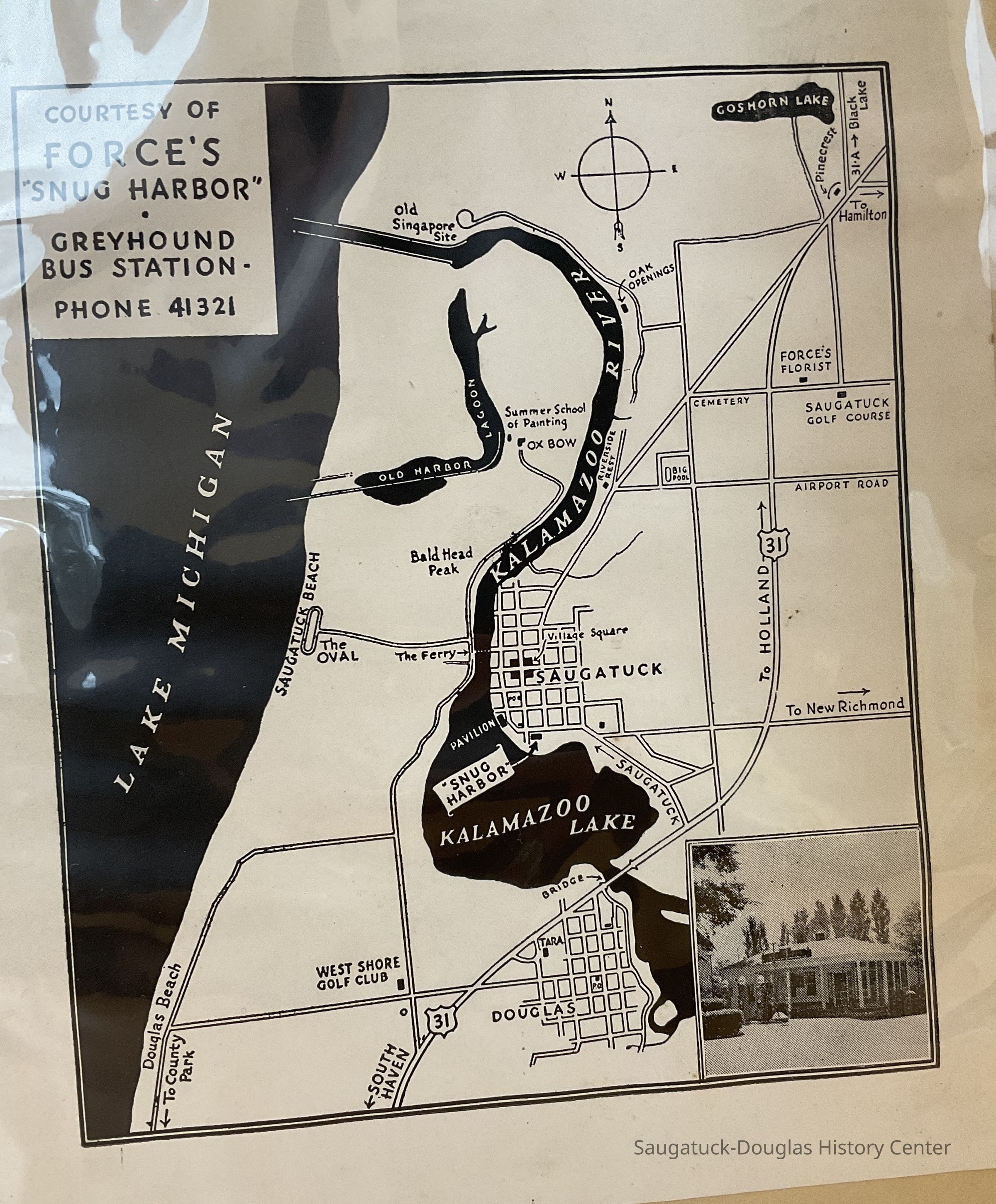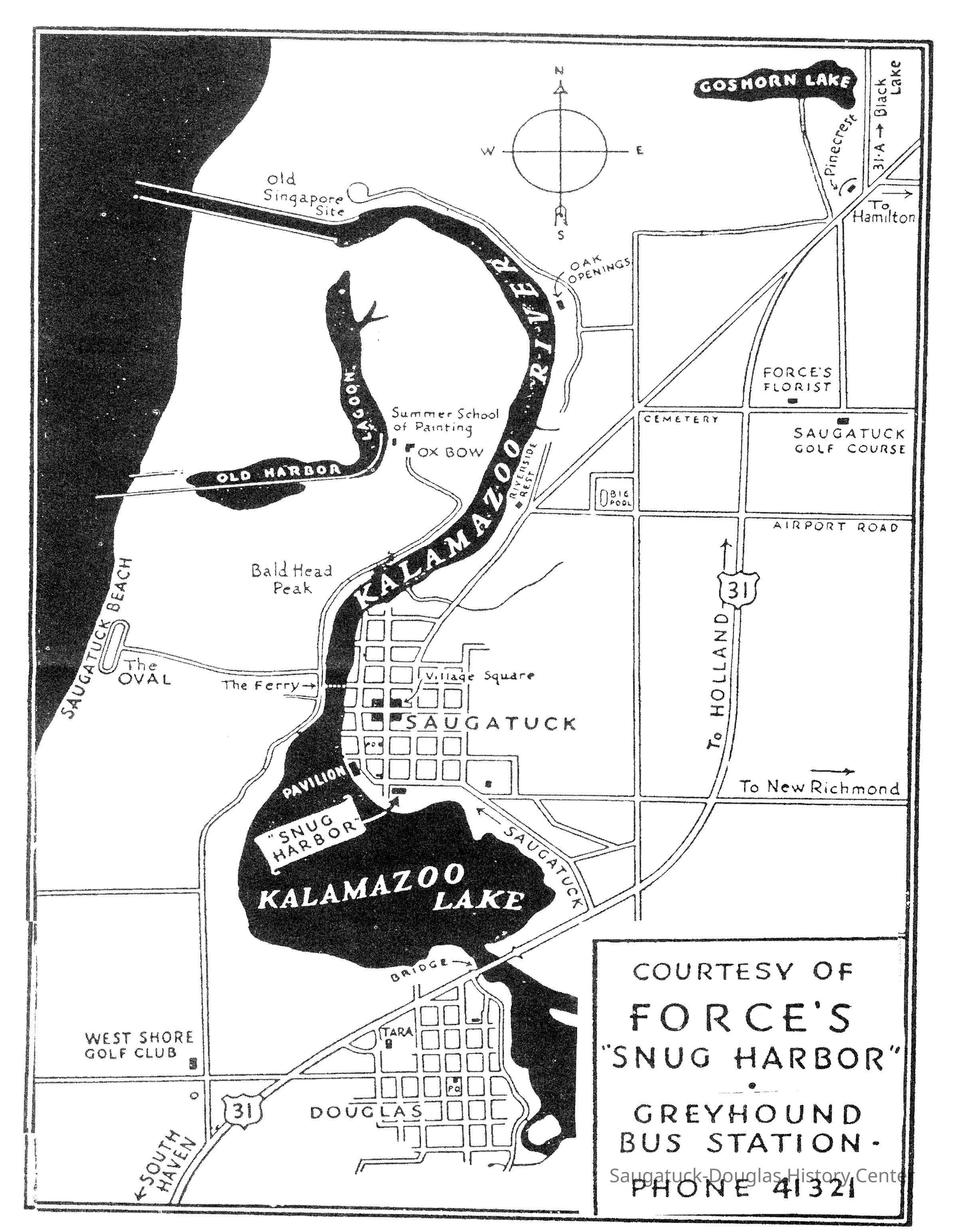 Map of Saugatuck showing the location of Ed Force's Snug Harbor gas station on the southeast corner of Culver and Butler St.Context