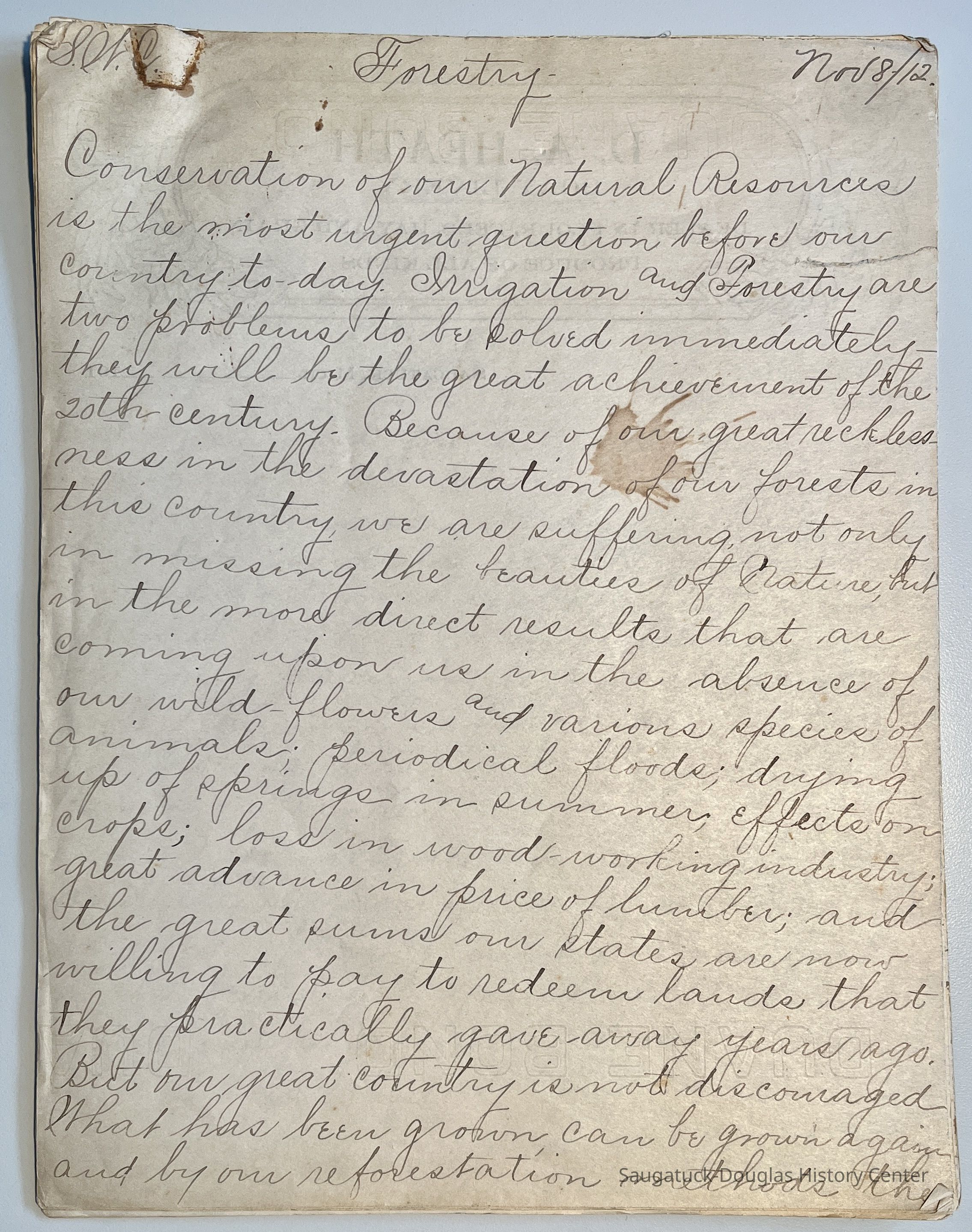 Nineteen-page, handwritten text for a speech read at the Saugatuck Woman's Club on November 8, 1912. The text is written in longhand on the backs of D.A. Heath letterhead.Context
