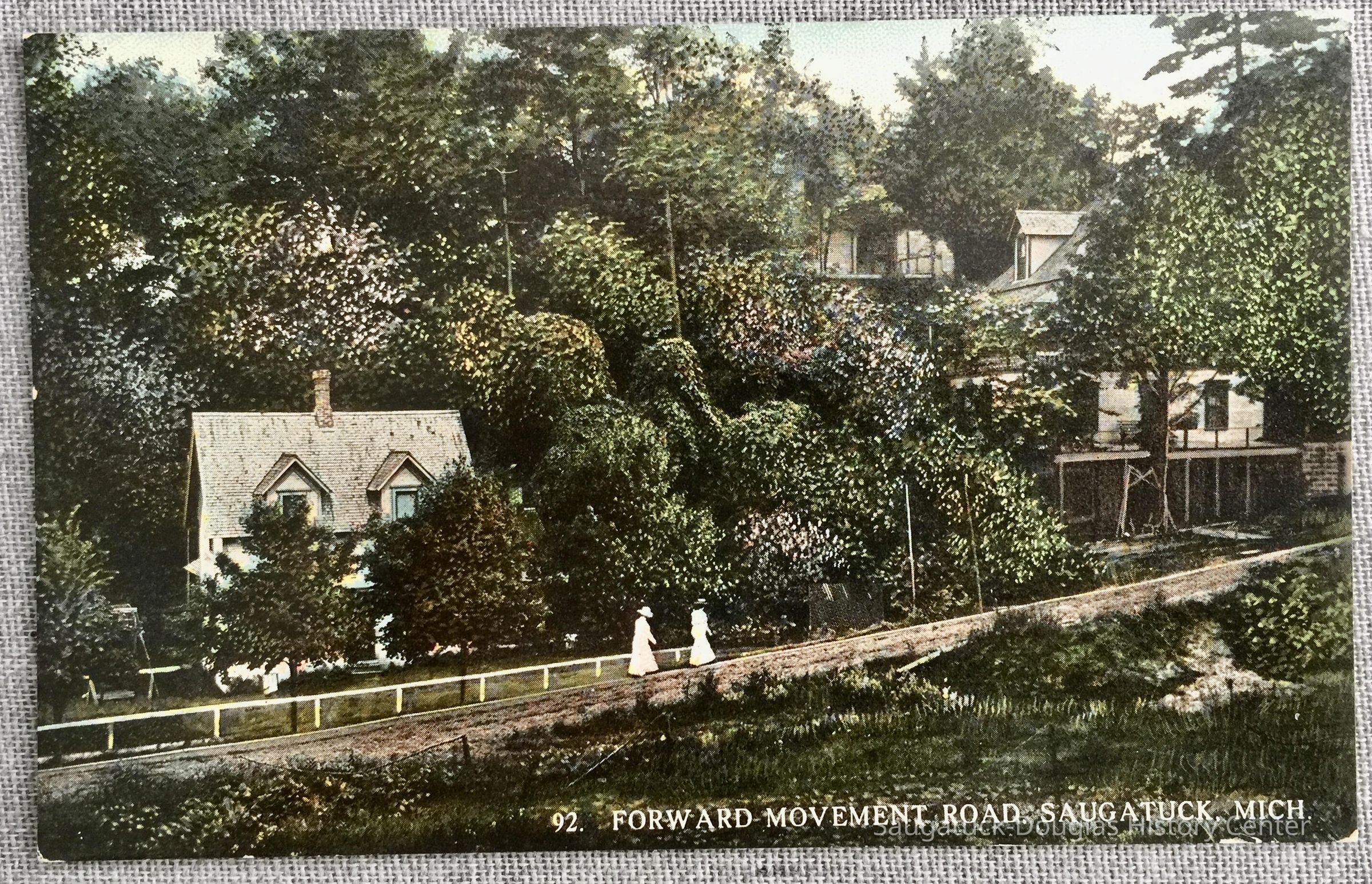 Two women in pale, long dresses stroll up a path, passing cottages hidden among the trees. Code R-38369 at bottom center and note that card is "Made in U.S.A."