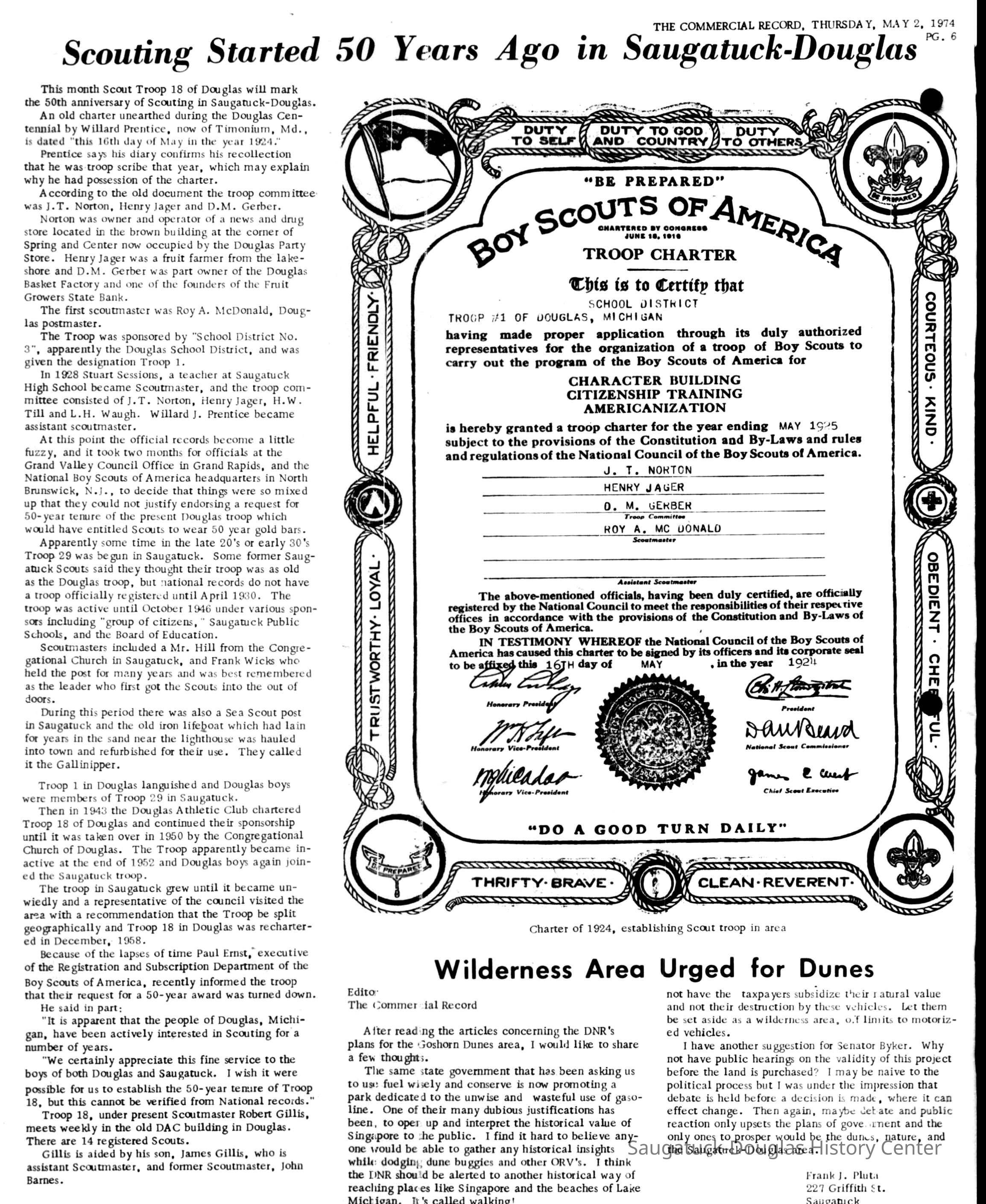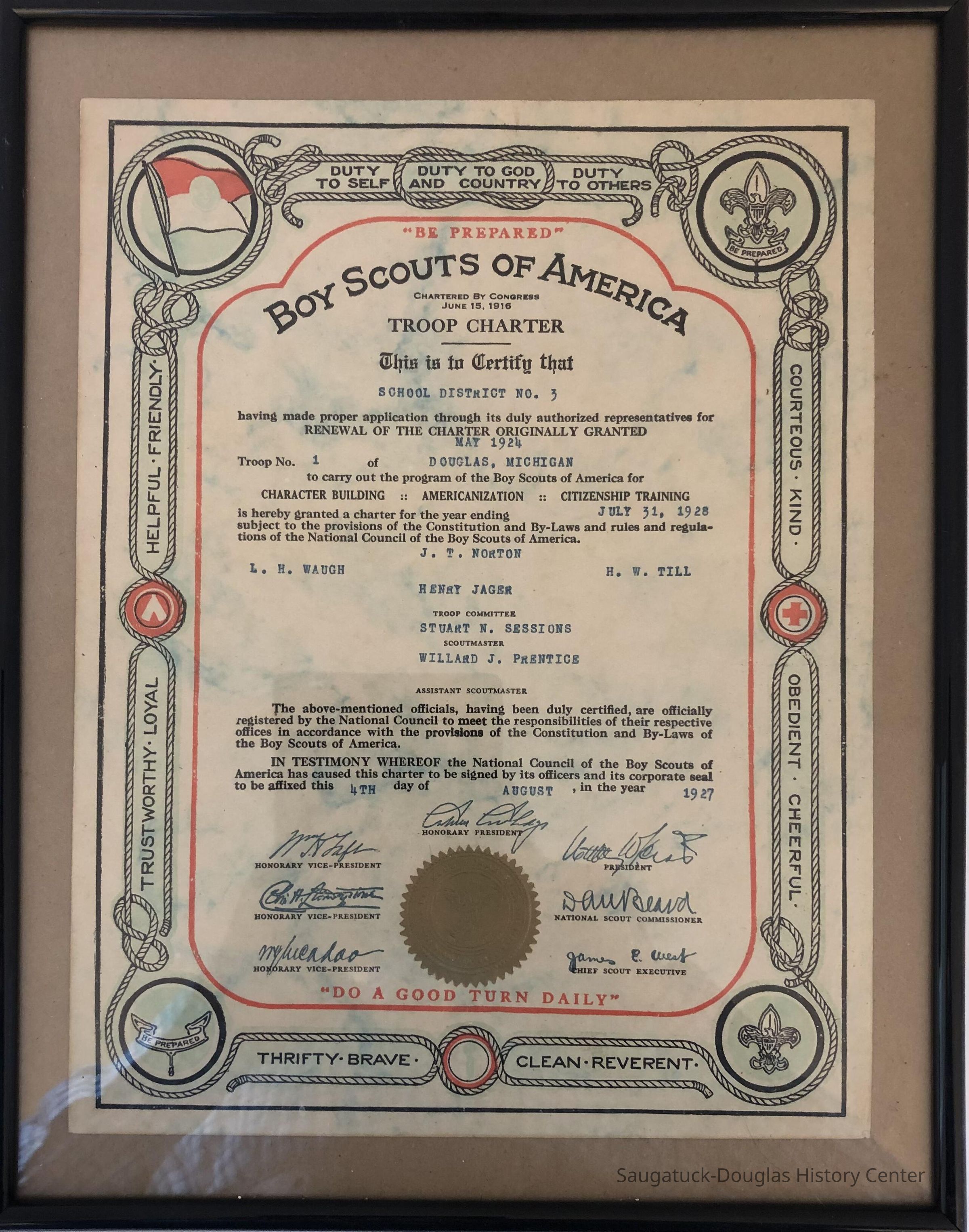 Framed Boy Scouts of America Troop Renewal Charter. Dated August 4th, 1927. Originally granted May 1924. For School District No. 3 Douglas, Michigan .Dimensions