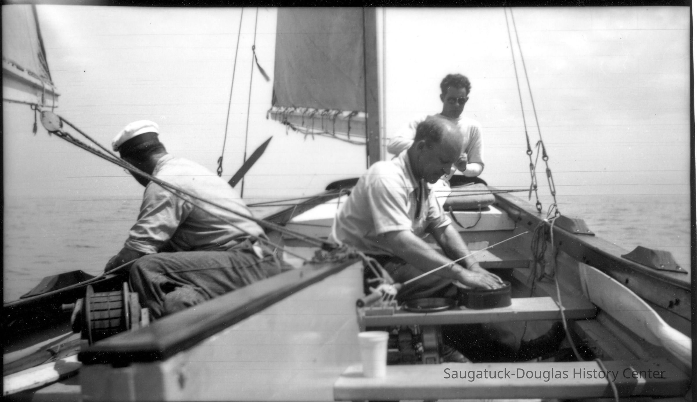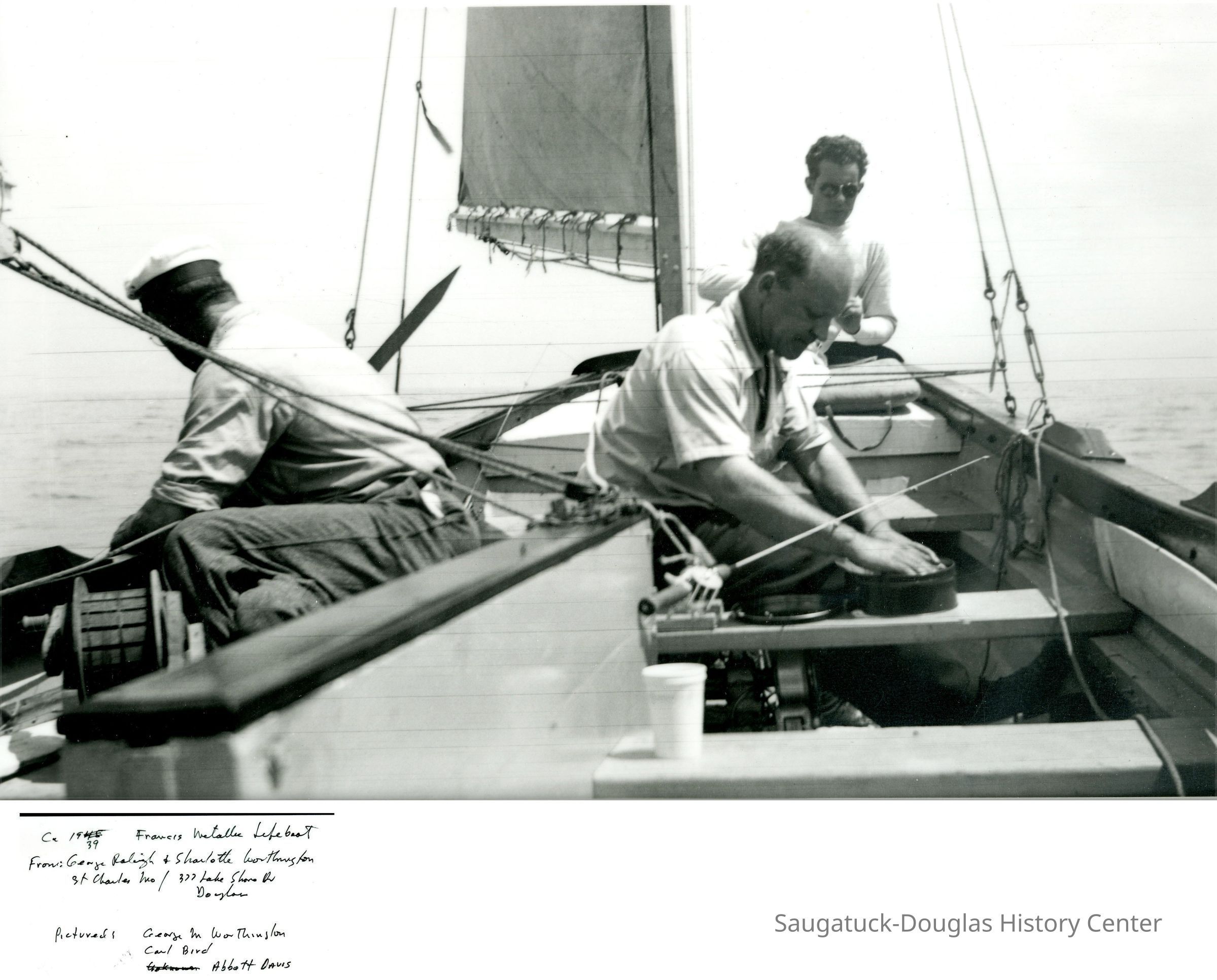Photo of George M. Worthington, Carl Bird, and Abbot Davis aboard the Francis Lifeboat,1939.
