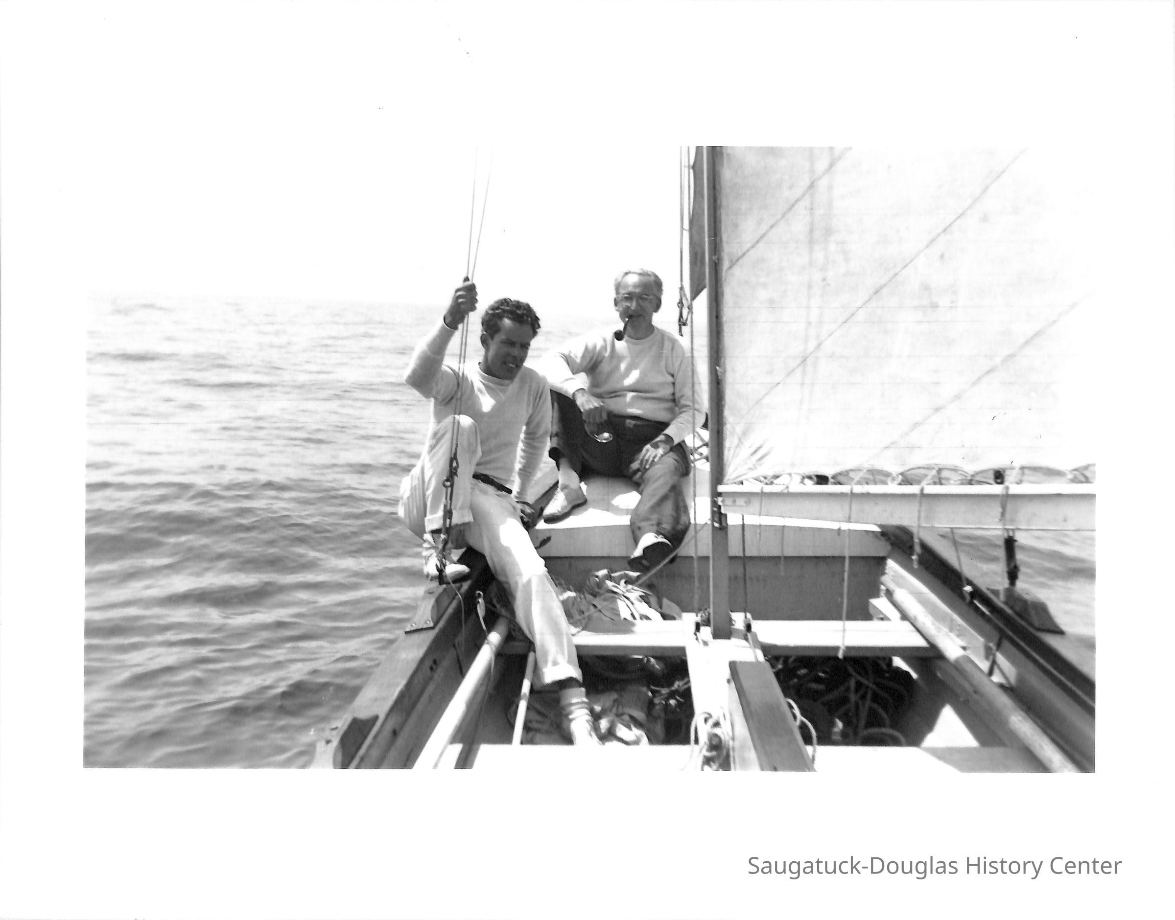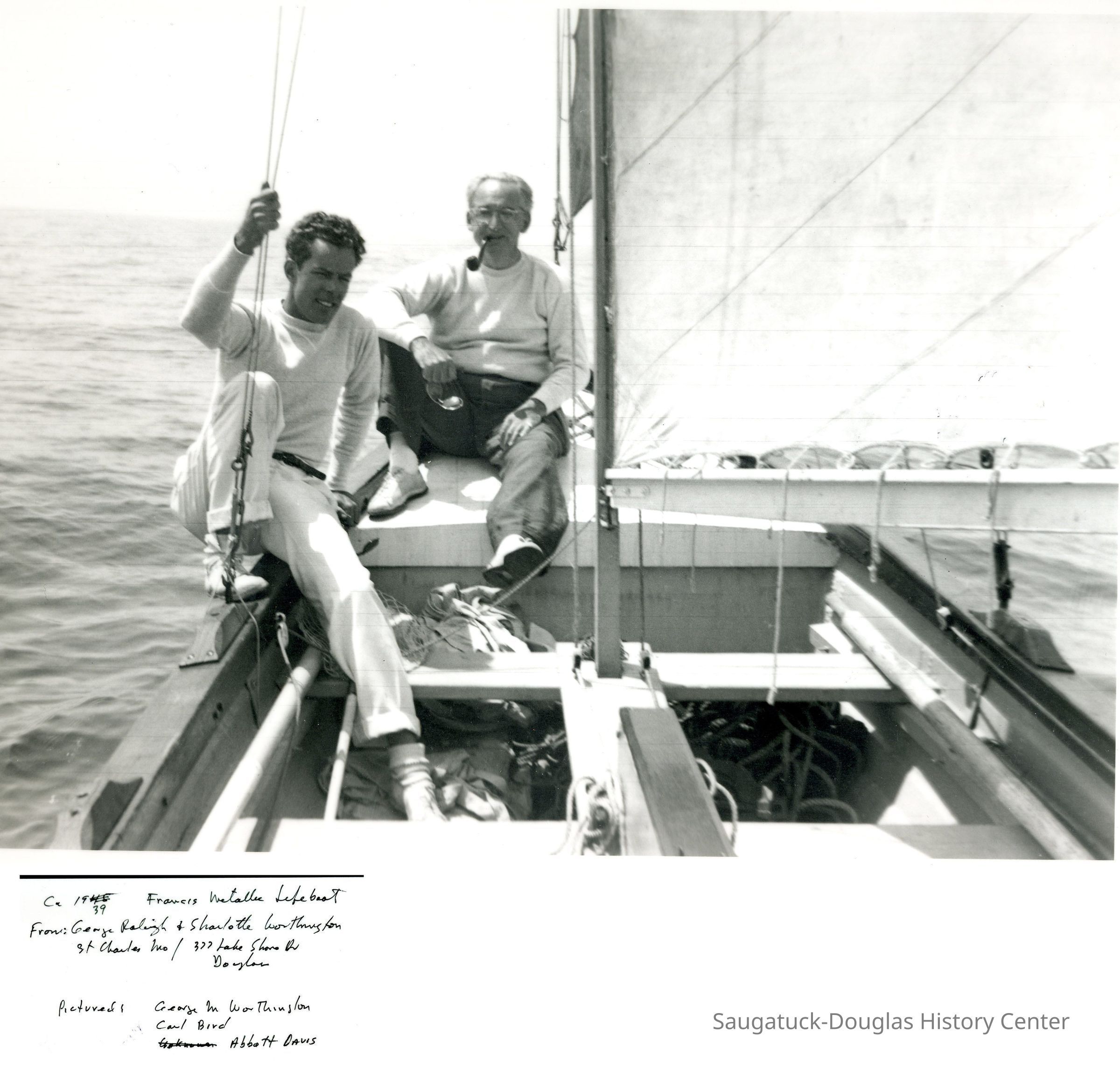 George Worthington and Raleigh W. McCormick on the Francis Lifeboat 13 miles out of Douglas, July 1939. Image measures 12" x 7.5" and is laminated.Photograph Details