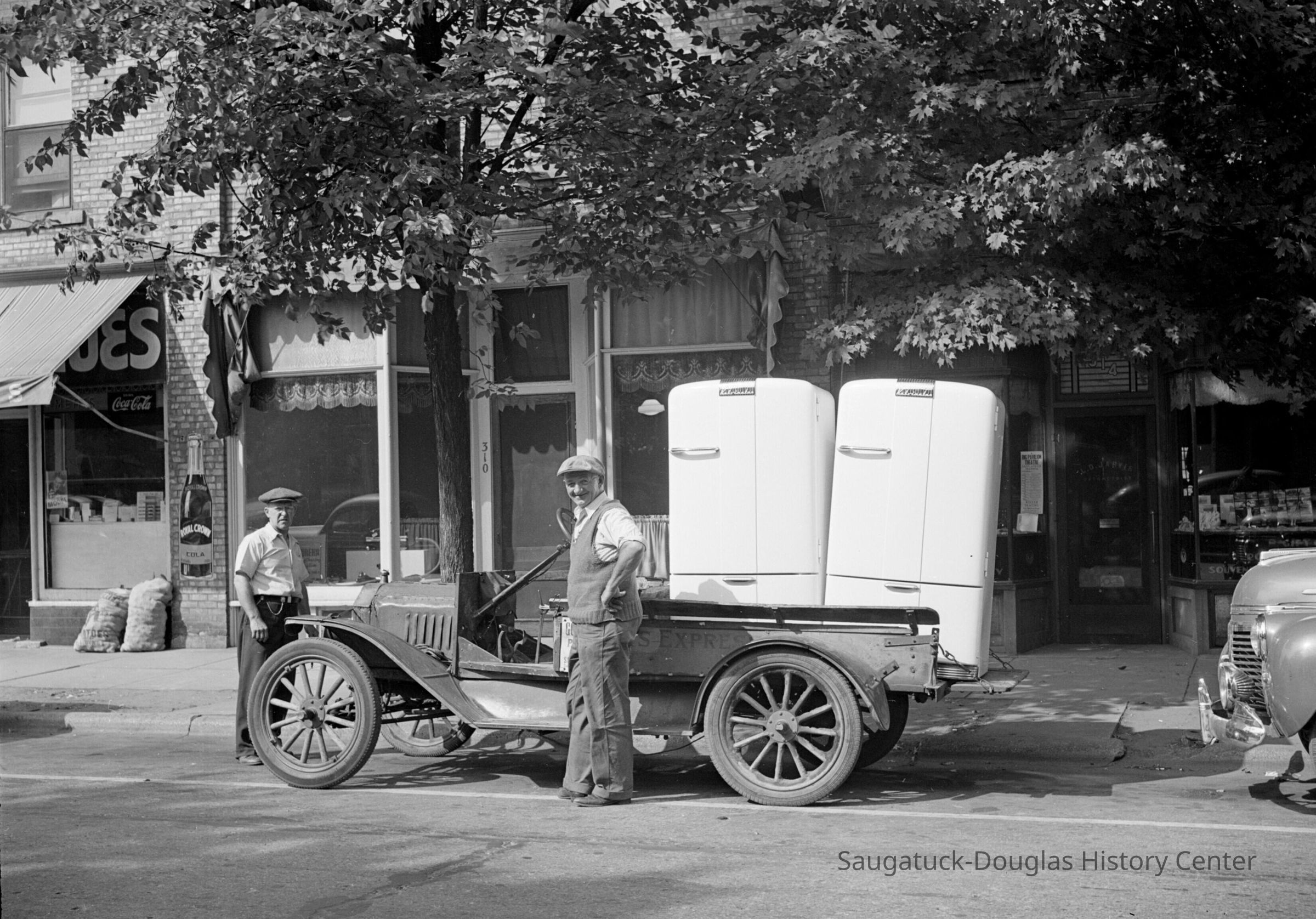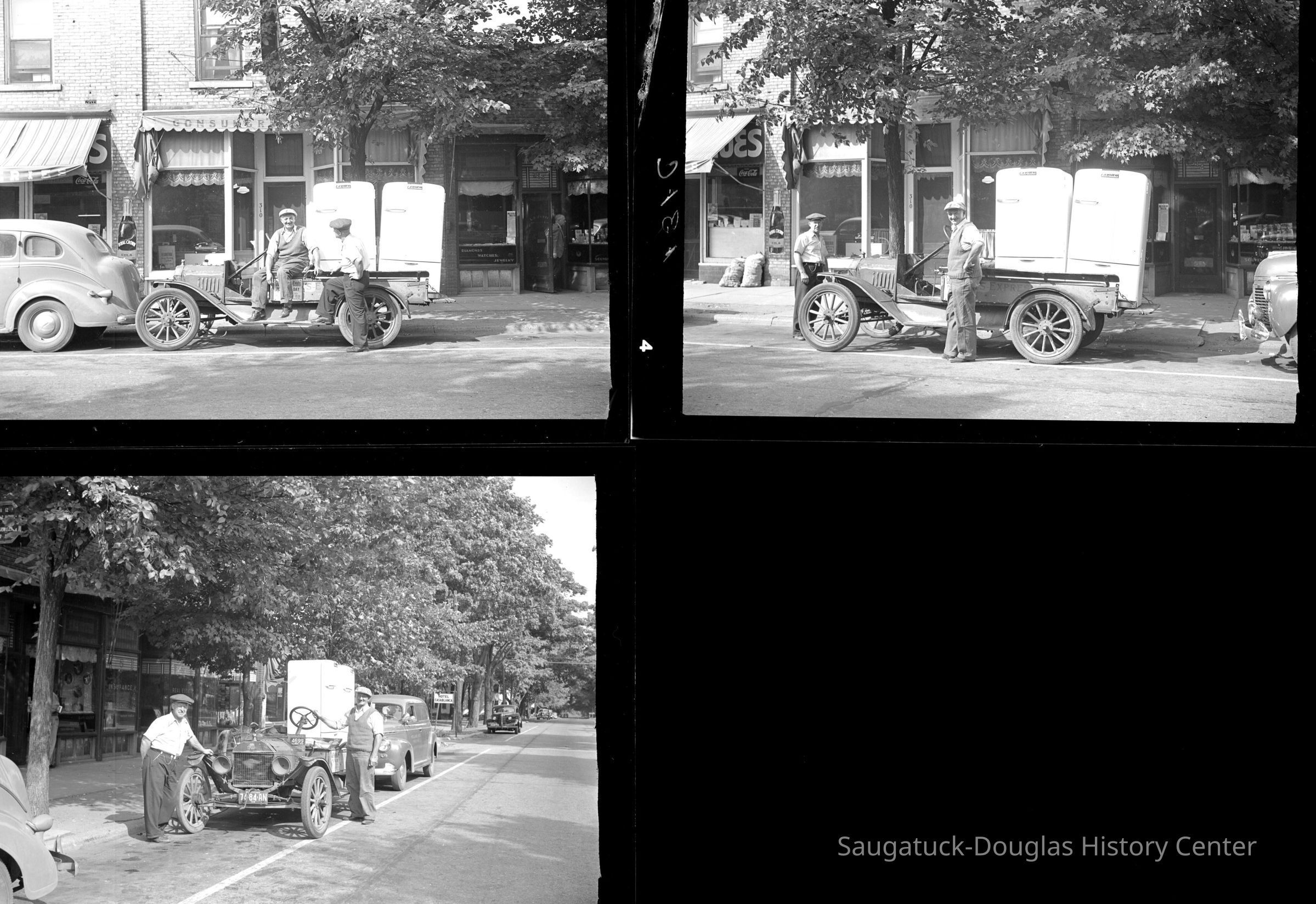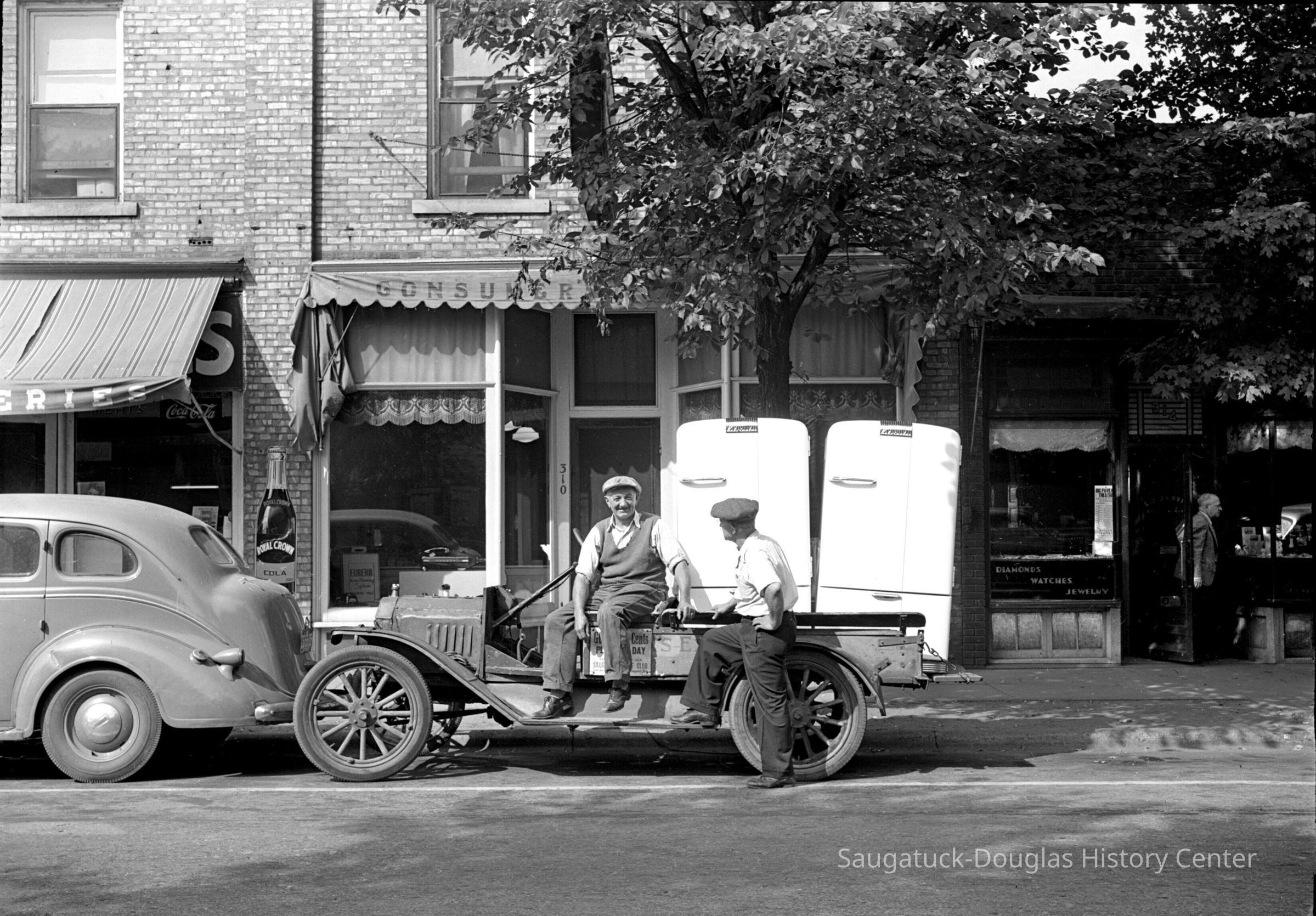 Frank Wicks and Abbot Davis with Frank's very old truck are delivering two refrigerators. Location is the Heath Block shops, 308-318 Butler Street.