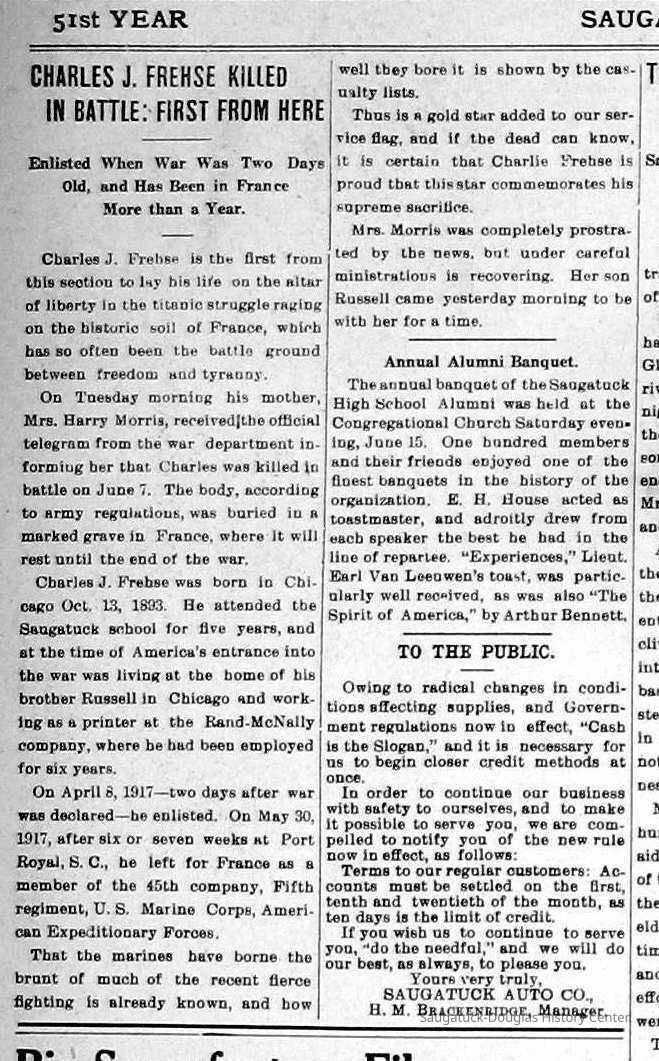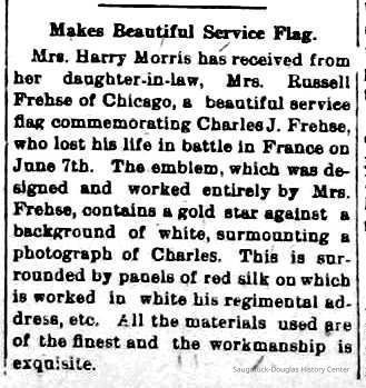 Frehse, Charles John 1893-1918, Morris, Lillian (Sterzing) Frehse 1872-1964, American Legion, 137 Bruner-Frehse Post, Saugatuck, American Legion Auxillary, Bruner-Frehse PostCreate Date