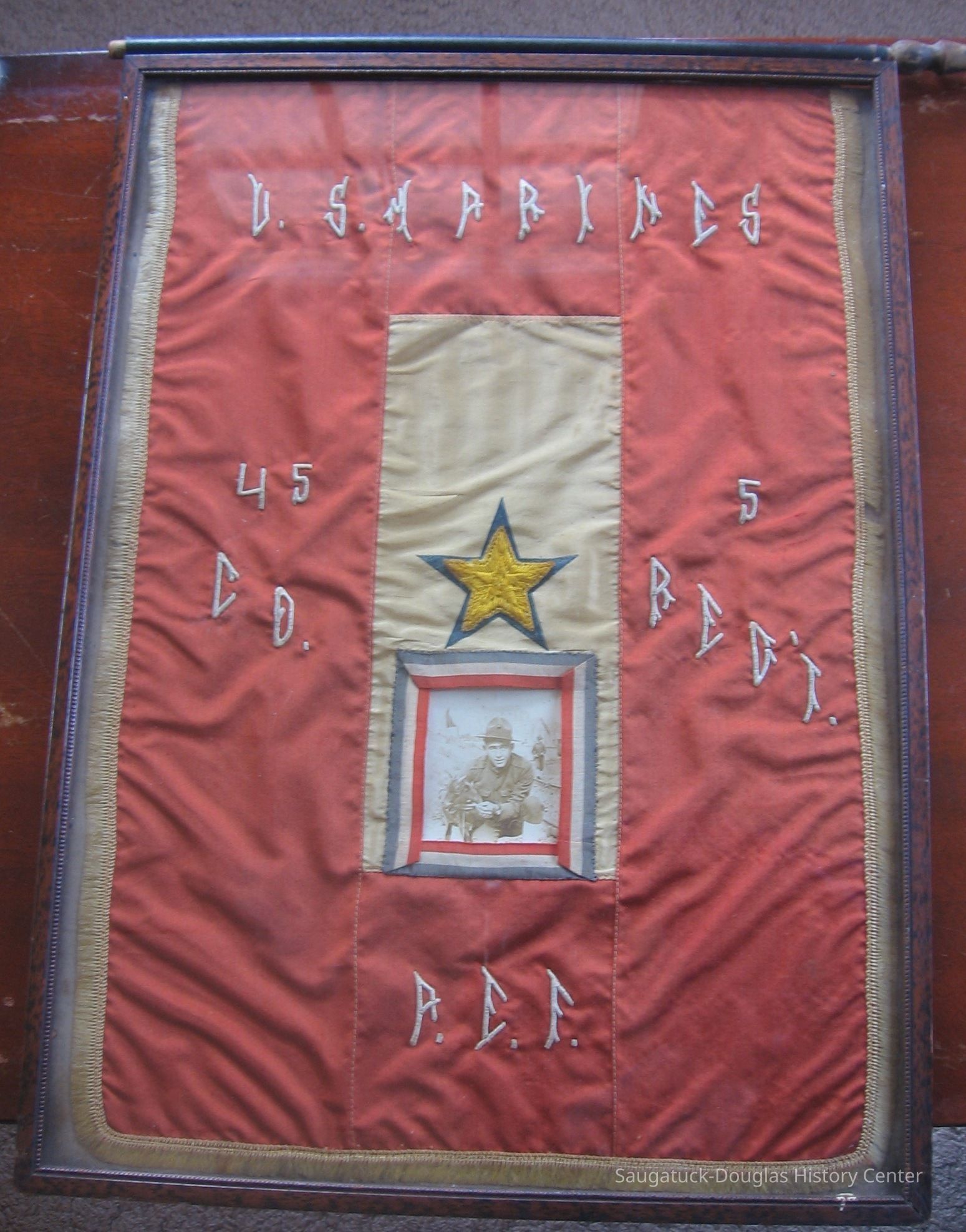 Text embroidered on the red fabric reads "U.S. Marines/45 Co./5 Regt./AEF [45th Company/5th Regiment/American Expeditionary Forces]