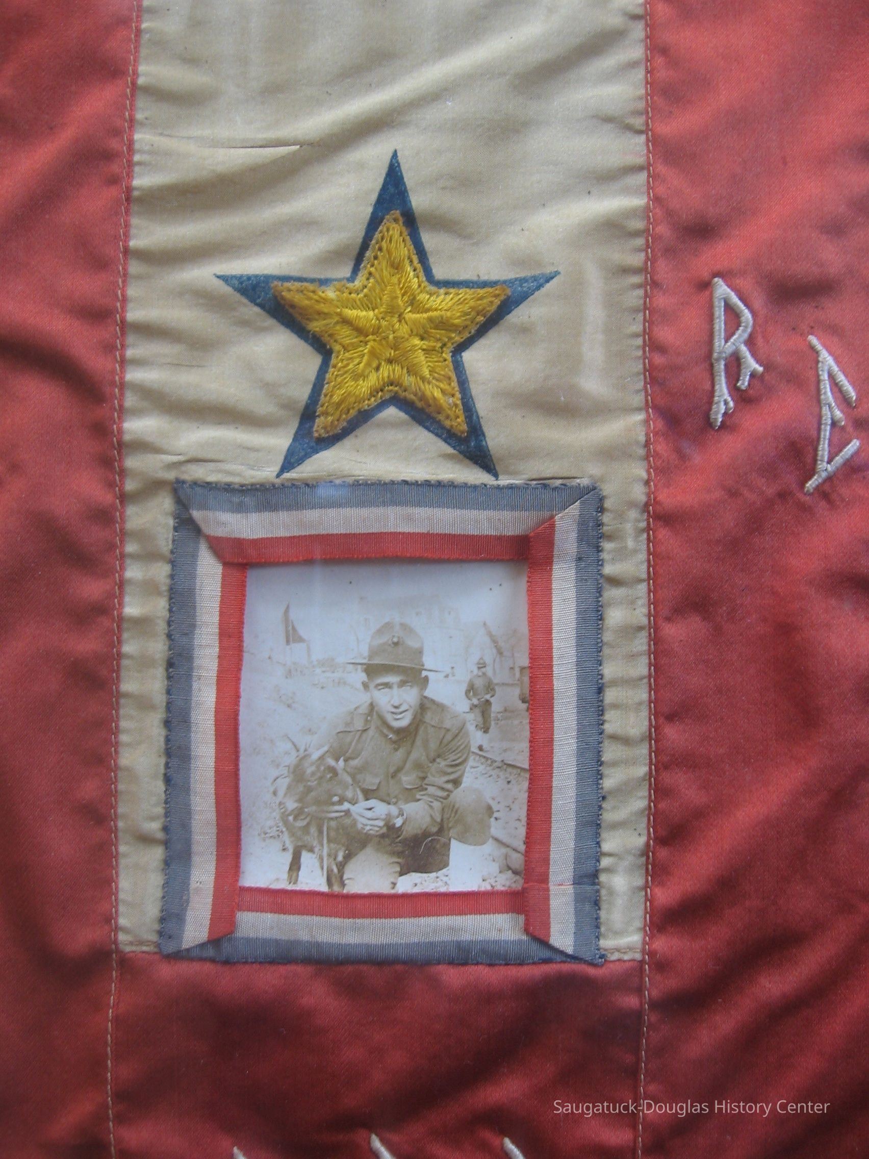 The banner is constructed for four pieces of red fabric surrounding a rectangle of white fabric. The white fabric is centered with a star embroidered in gold thread over a blue, printed star of service. A red, white and blue ribbon-edged pocket that frames a photo of Charles J. Freshe, in his soldier's uniform, posing with a goat.