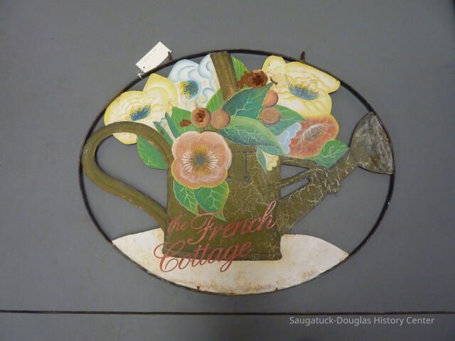 Floral painted metal sign with cutouts. The words French Cottage are superimposed on the top.Collection