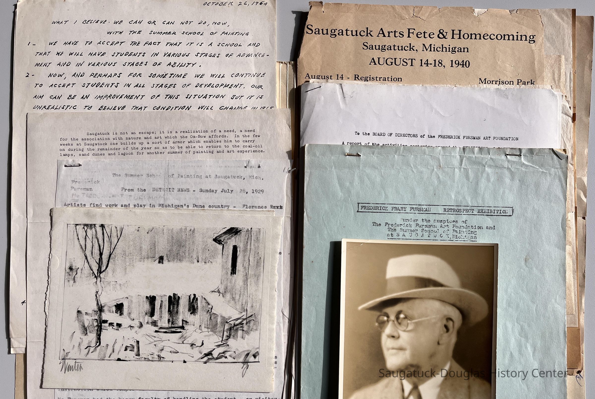 1964 Fursman retrospective exhibition at Women's Club document listing works on display, biography and analysis of his style, the Saugatuck Art Association, the founding of the Summer School of Painting (Ox-Bow) and list of the boards of directors and committee members including Arthur F. Deam, Thyra Deam, Celia House, Alice Mason, Pearl M. Hart, Theodor Draynik, Gerald Landt, Alfred Maurice, Bernice Morrissey, Doris Serrins, Margaret Schumacher, Audrey Kettlewell, Cora Bliss Taylor, Jean Goldsmith, Rosalind Meyer, Ruth Turner, Elsie Legatz, Jack Polka, Marian Bode, Robert Lokker, Rachel Faucett, Jamed Duggan, Terrence Erwin Gallery, Mrs. Frank Wicks, Clarence Lynds, Emily Parks, Mrs. Emory Wilder, Isobel McFaul, Mrs. Avis Bates, Lucille Ansley, William Simmons, Olga Byfield, Marge Breckinridge, Joseph Legatz, John Ross, John Kettlewell, Christiana Hoerrman, William Allen, Frank Denison, Howard DeMyer, Harry Underhill, George Clark, Henry Hopper, Kenneth Miller, Robert Hewman, Verne Hohl, Charles Gilman, John Constantine, Alfred Maurice, Imogene Noud and Sally Allen.