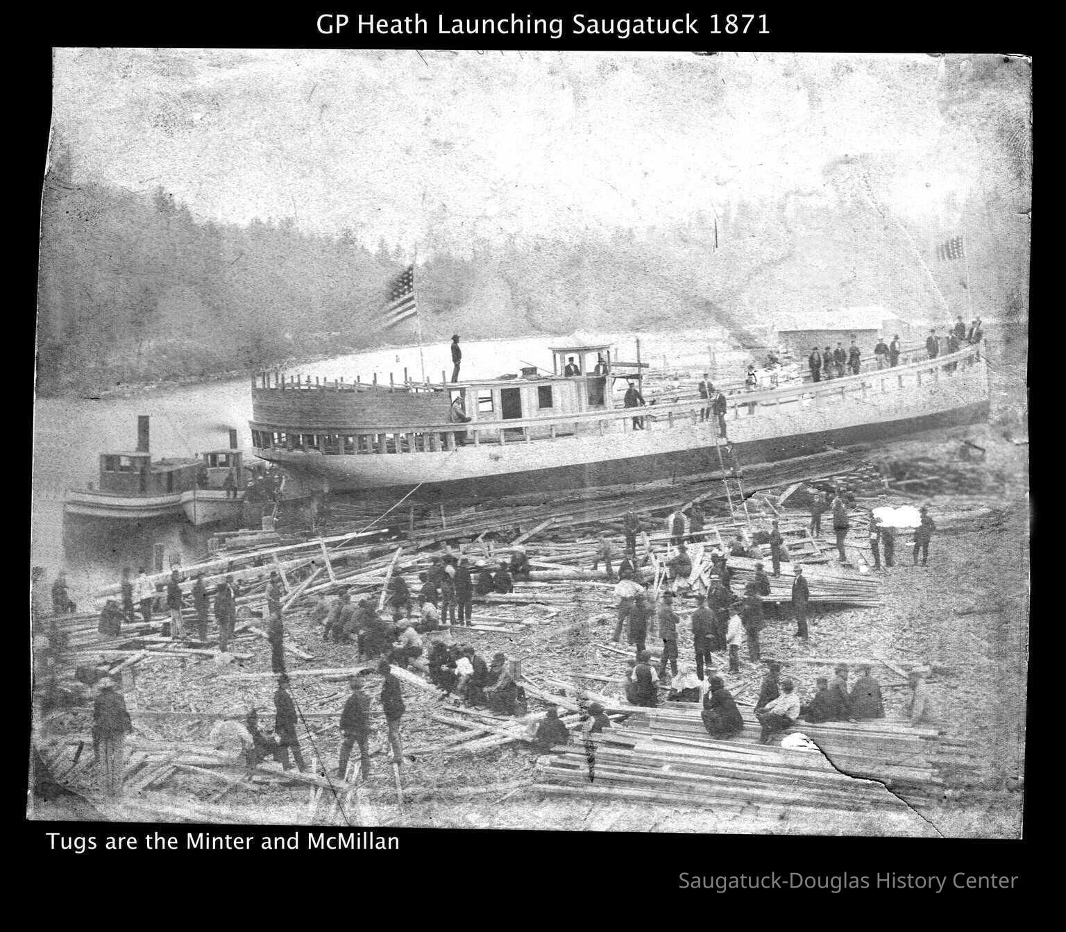 More than 40 people are standing or sitting on lumber in the foreground of a ship yard. In the background a ship, likely the steamer G.P. Heath, may be preparing to launch or has just launched. Two tugs are close to the bow of the ship. A flag is flying yet appears most of the people are waiting rather than working.