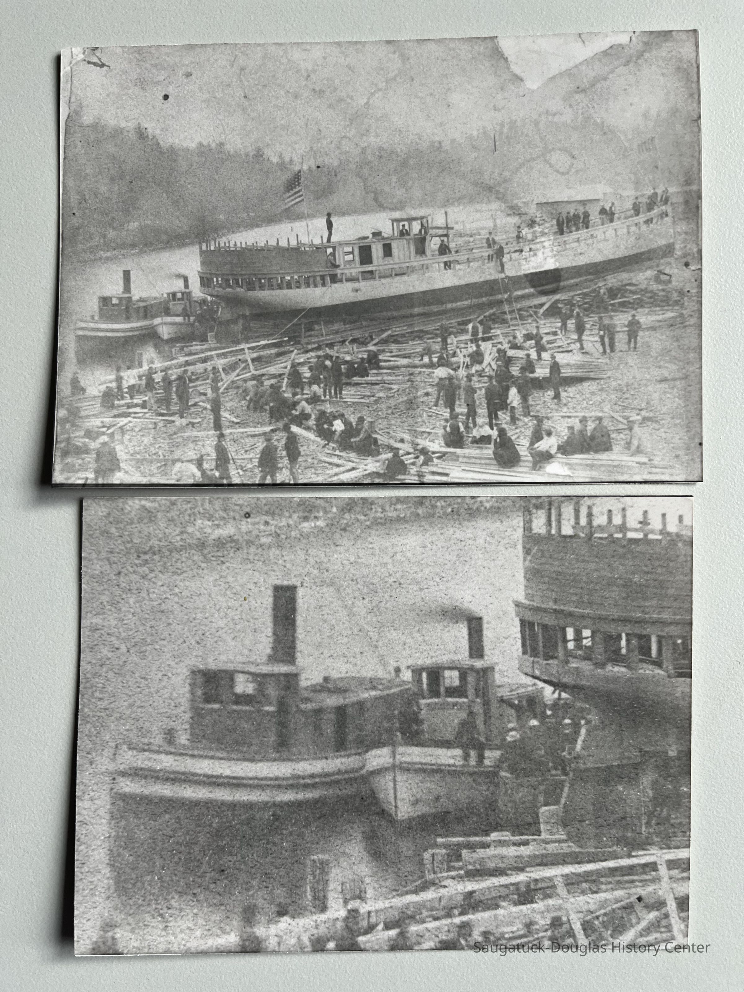 These images are modern prints of a historic but damaged original or negative. The second image is a close-up detail of the working tugs.Photograph Details
