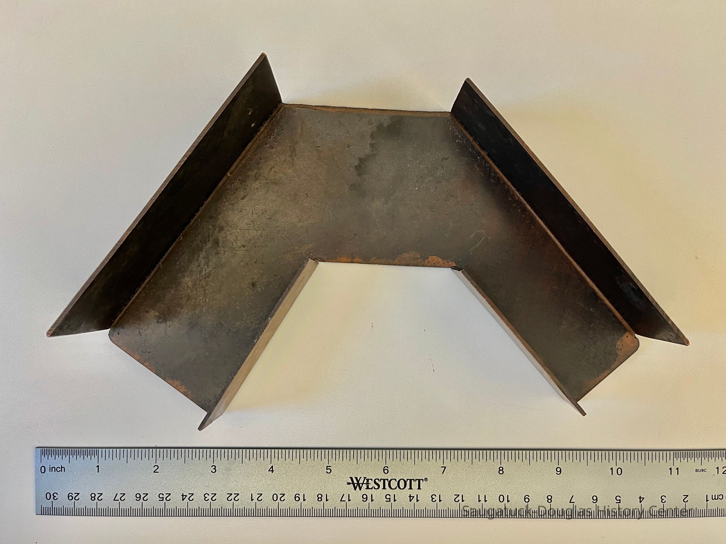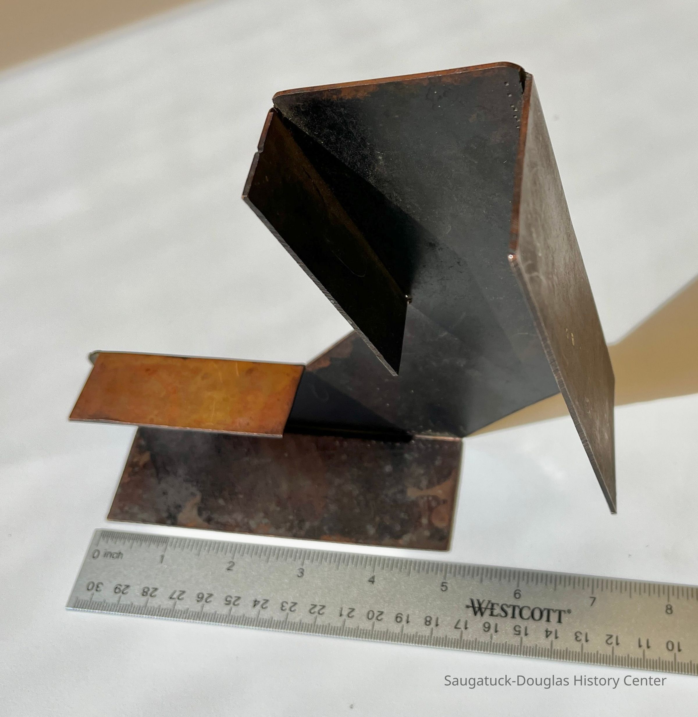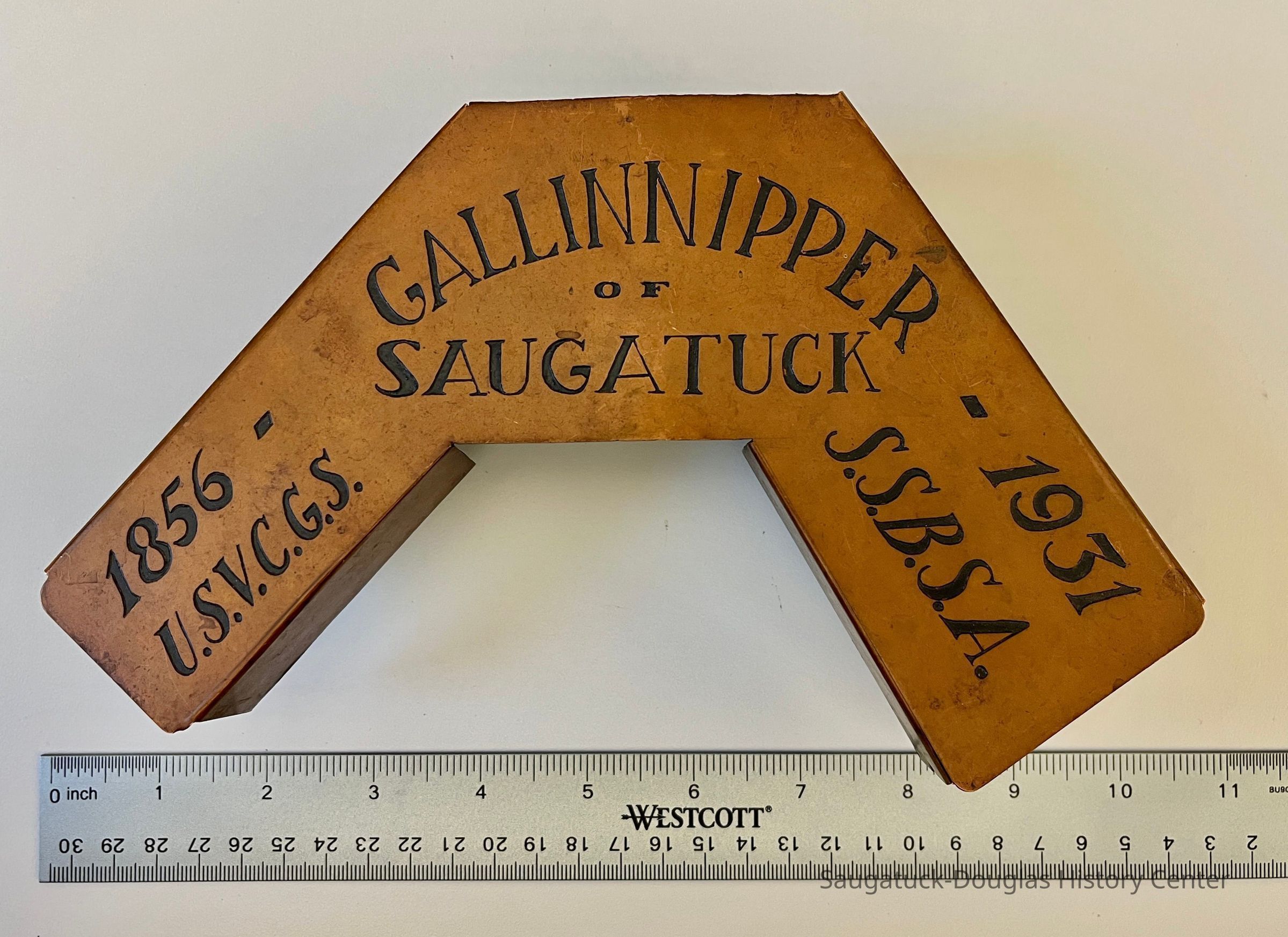 Sheet metal, possibly copper, V-shaped name plate, hand engraved with "Gallinnipper of Saugatuck / 1856-1931 / U.S.V.C.G.S / S.S.B.S.A"