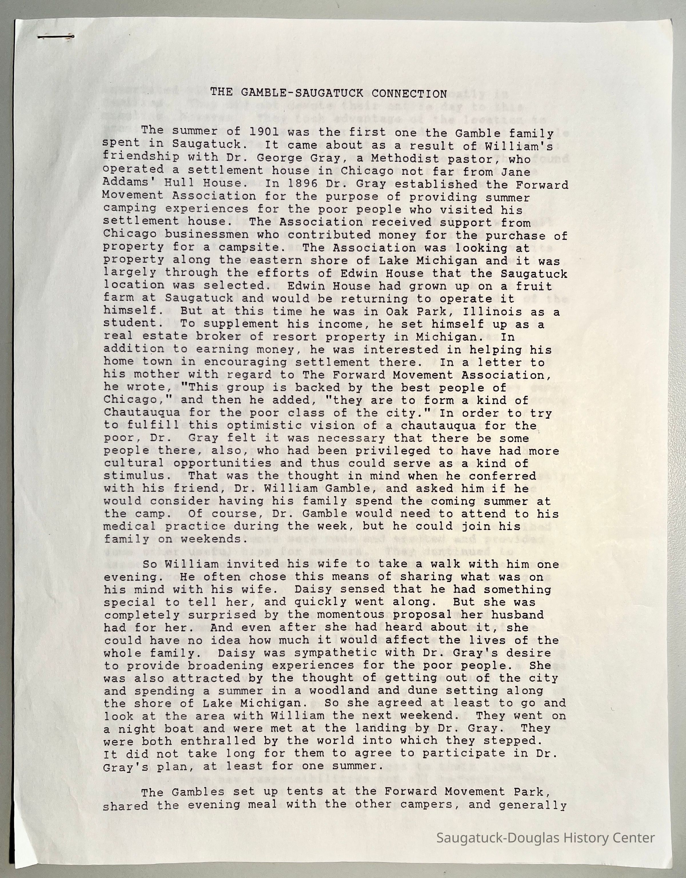 Three page, typewritten essay written by Katharine (House) Allen in 1992 that recounts the Gamble family's connections to the Saugatuck area.