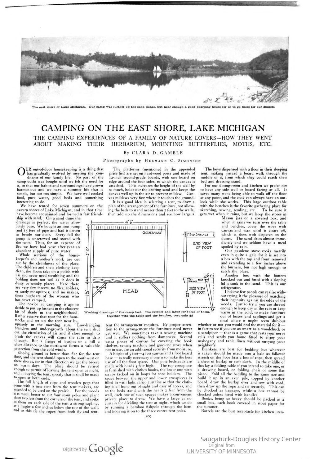 CAMPING ON THE EAST SHORE, LAKE MICHIGAN THE CAMPING EXPERIENCES OF A FAMILY OF NATURE LOVERS-HOW THEY WENT ABOUT MAKING THEIR HERBARIUM, MOUNTING BUTTERFLIES, MOTHS, ETC.