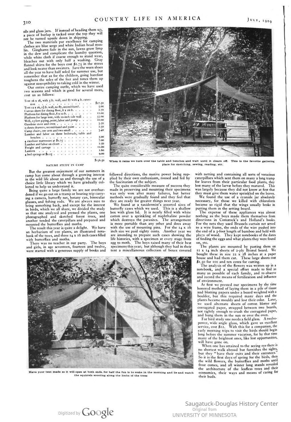 which was published in 1909. In it she described exactly how their tents were made and erected and provided some other useful tips for campers. They continued to associate with other residents of the camp each summer and to attend programs and lectures, in many cases as inspiring as nature, itself.