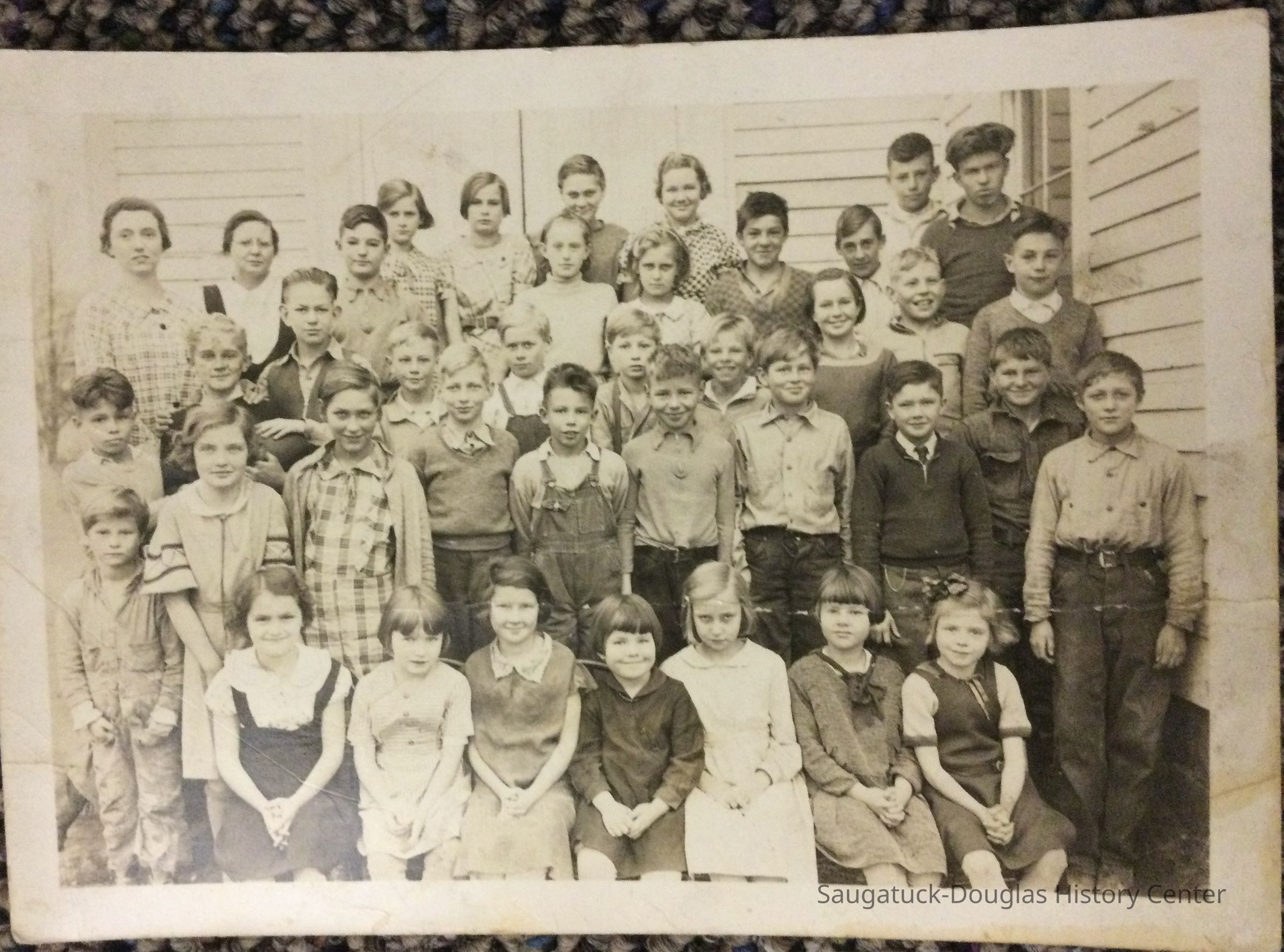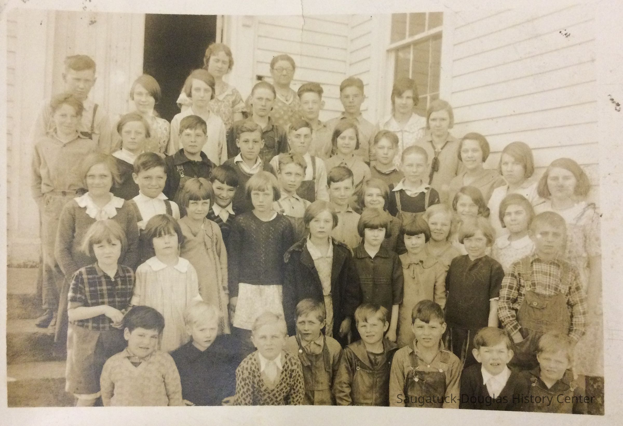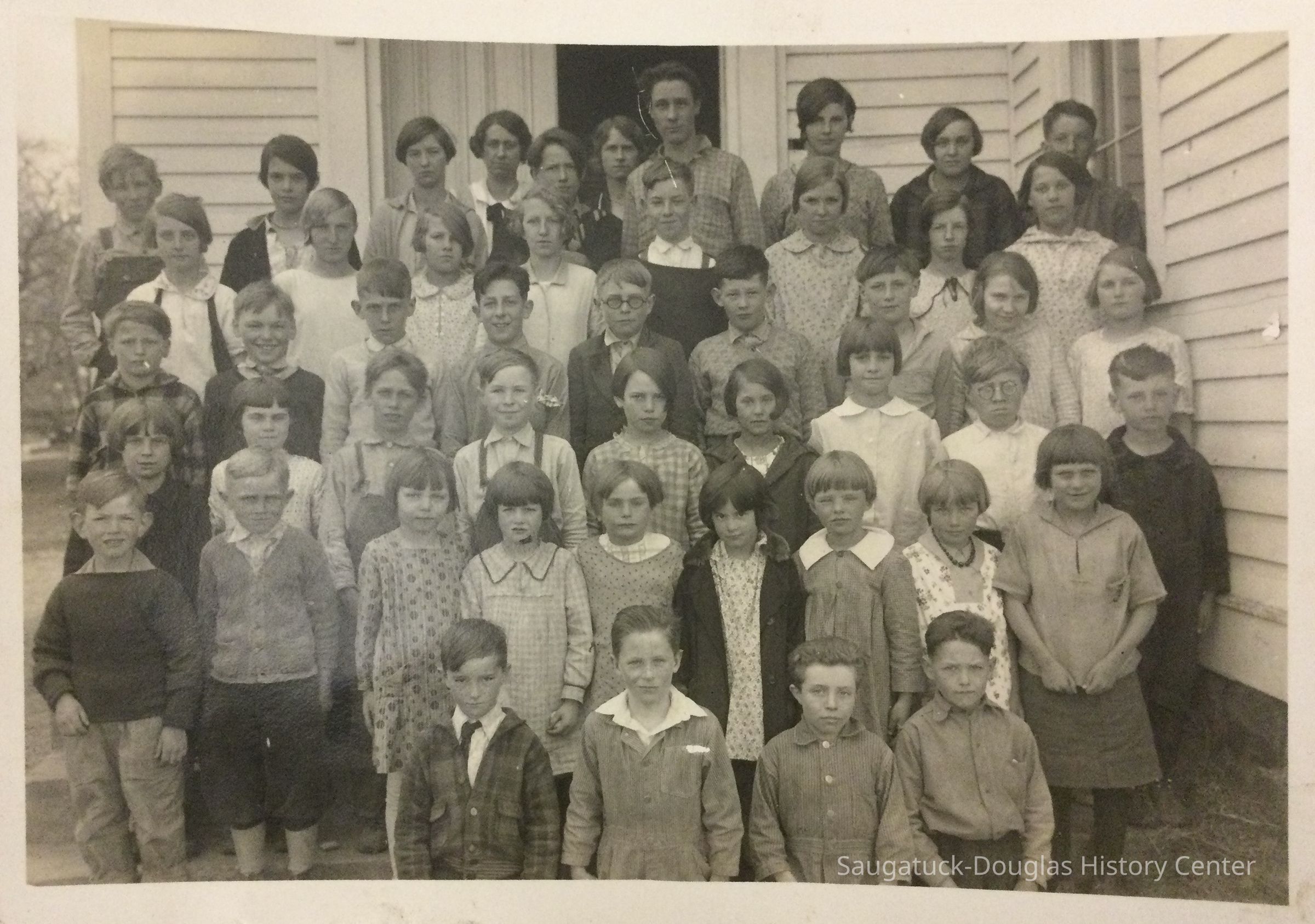 Four photos of Ganges Union School students posed outside the building. Each photo has 30 to 40 pupils, likely of many grades combined, and 2 to 3 adults, likely teachers or administrators. In three of the photos they children are dressed in their school clothes but one photo must have been taken on an unusually cold picture day because the students are wearing hats and gloves.Photograph Details
