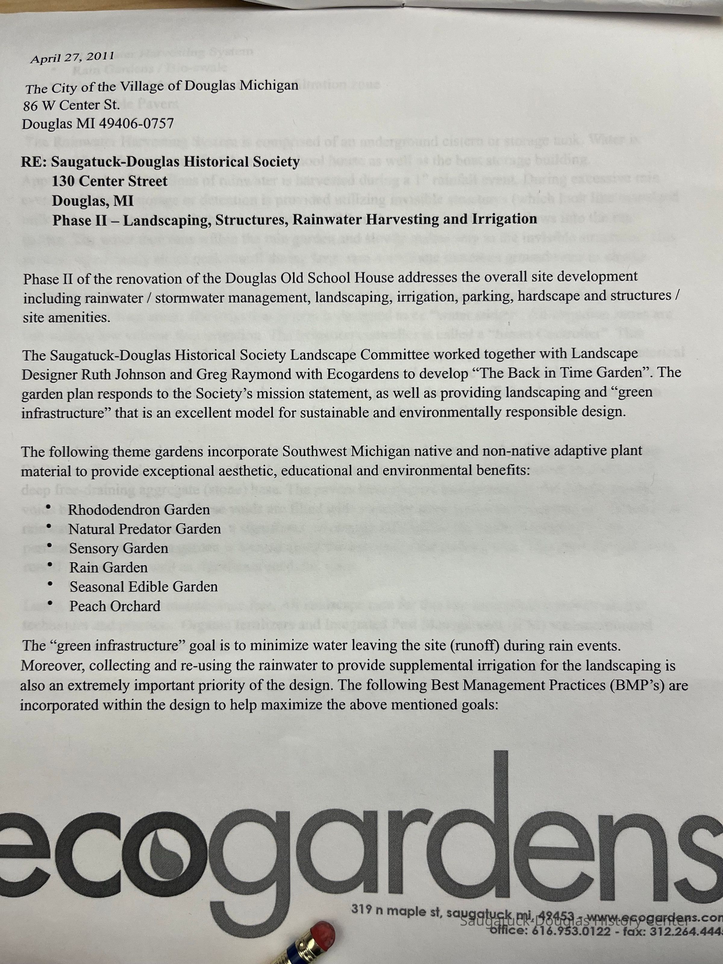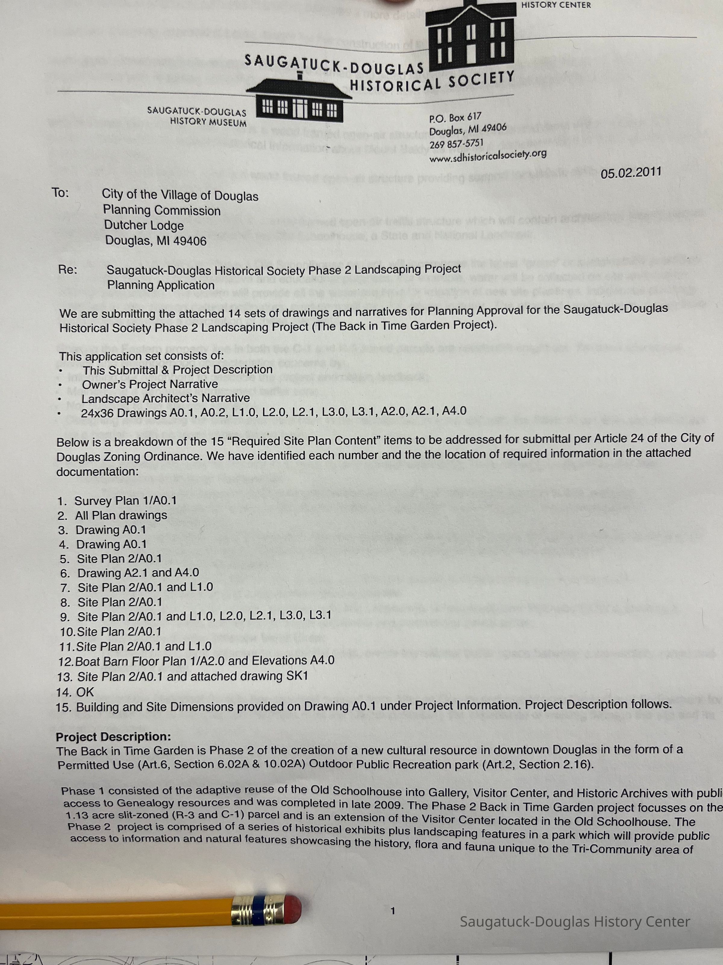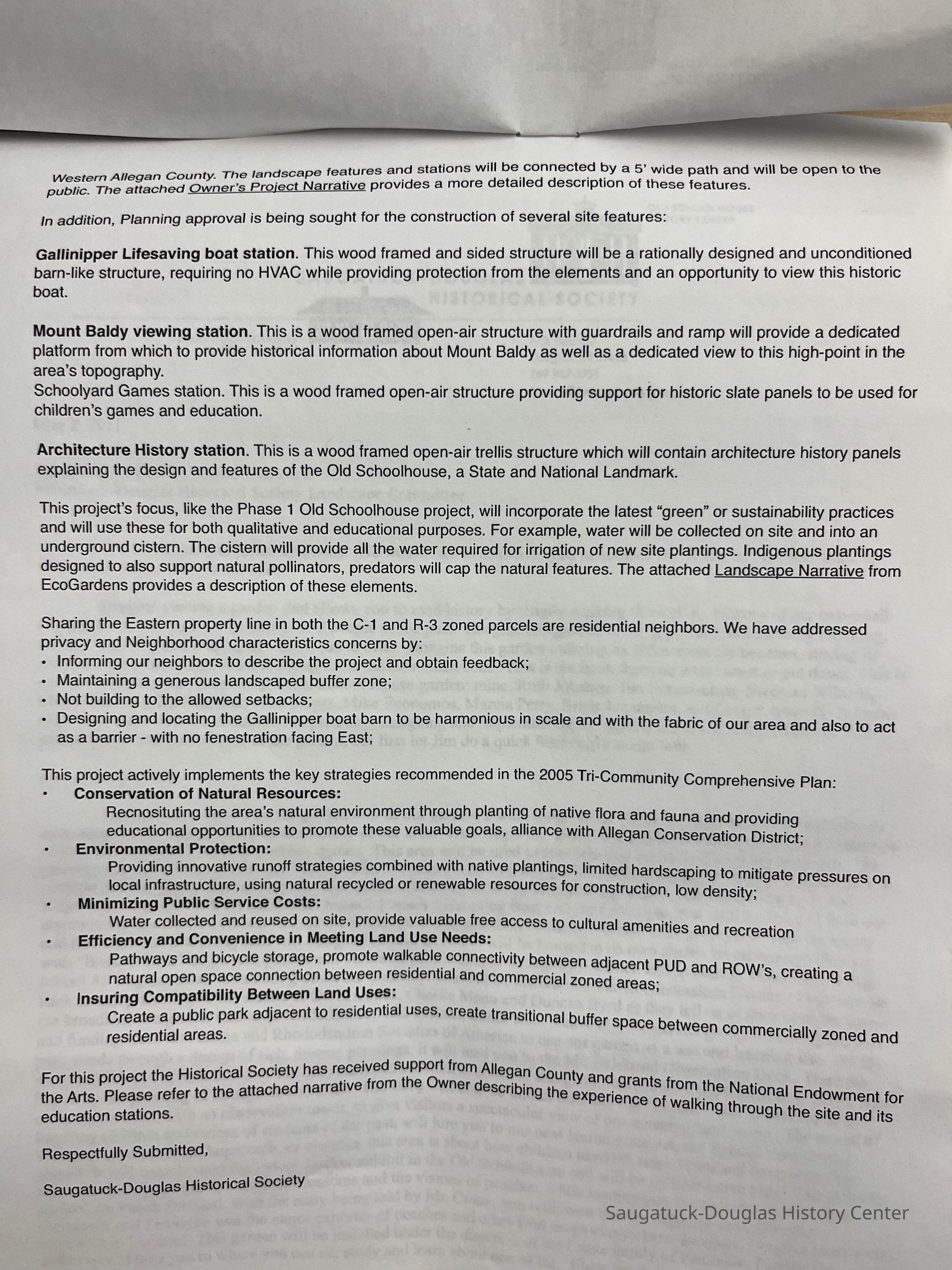 Attached to 2016.03.10.a is a copy of the application to the Village of Douglas for approval of the plan. This includes the 2-page application letter and additional “narrative”.Collection