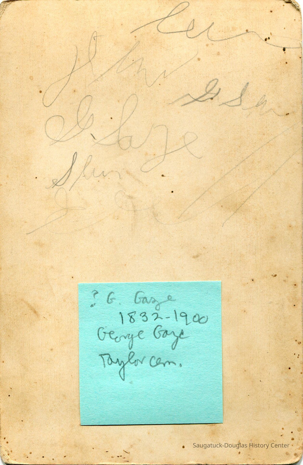 Pencil writing on the back of the card is unreadable but a green post-it notes the man to be George W. Gaze (1832-1900), Taylor Cemetery. It could also be George W.'s son George C. Gaze (1867-1953).Photograph Details