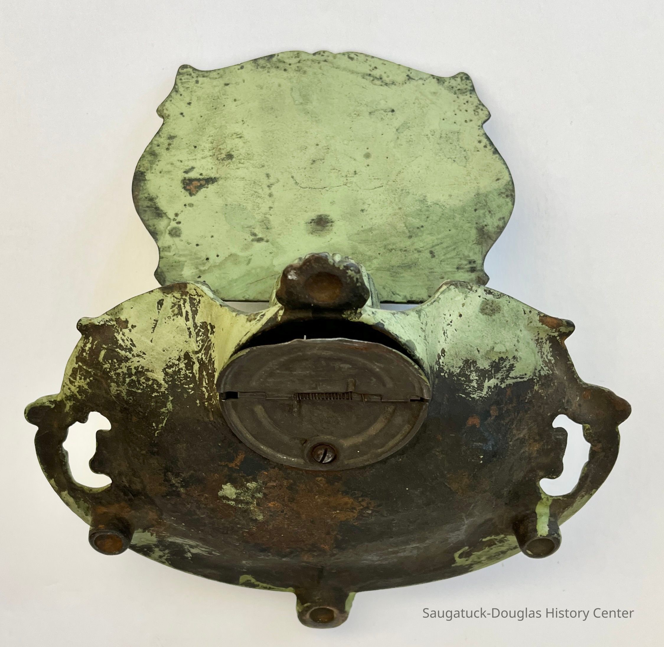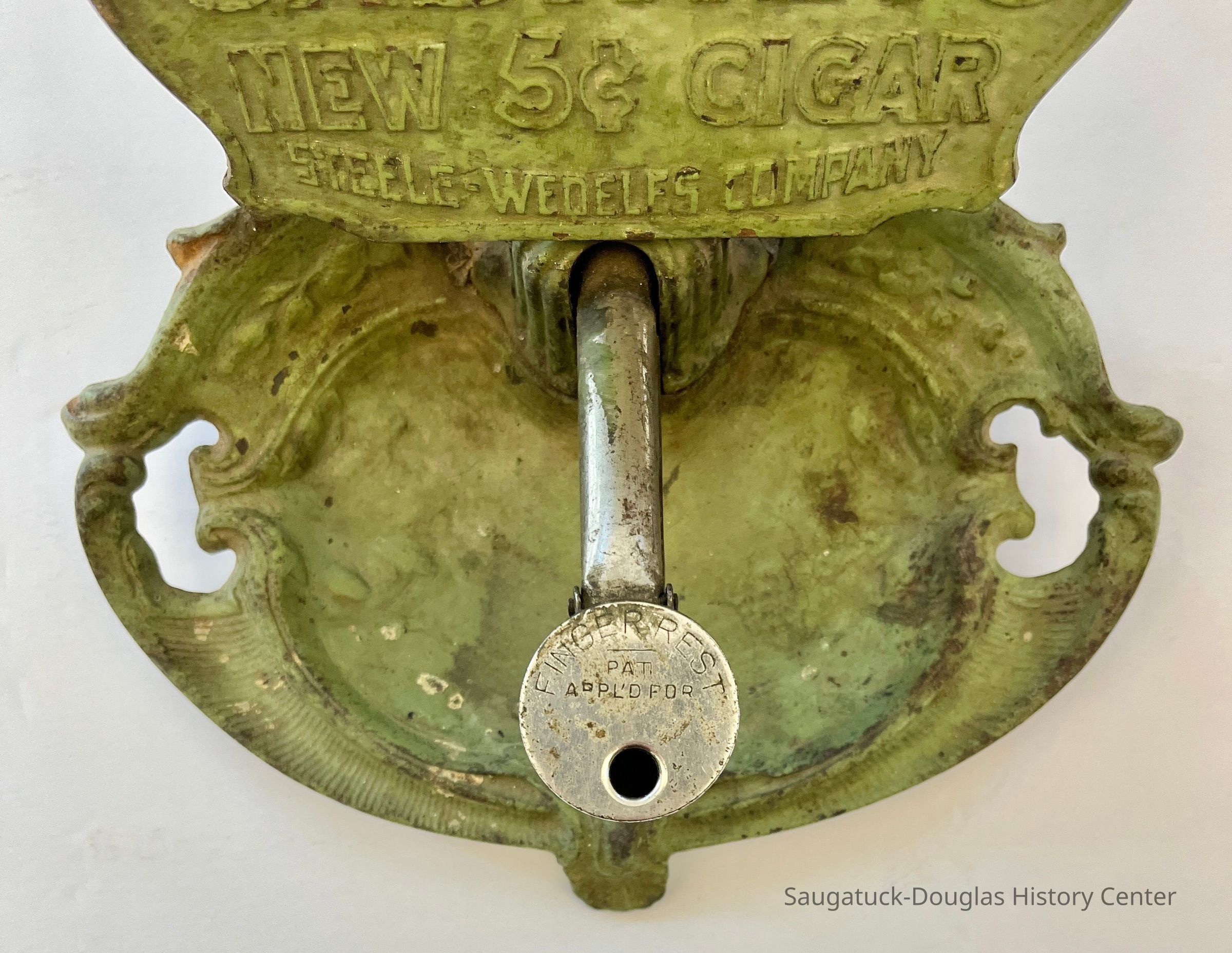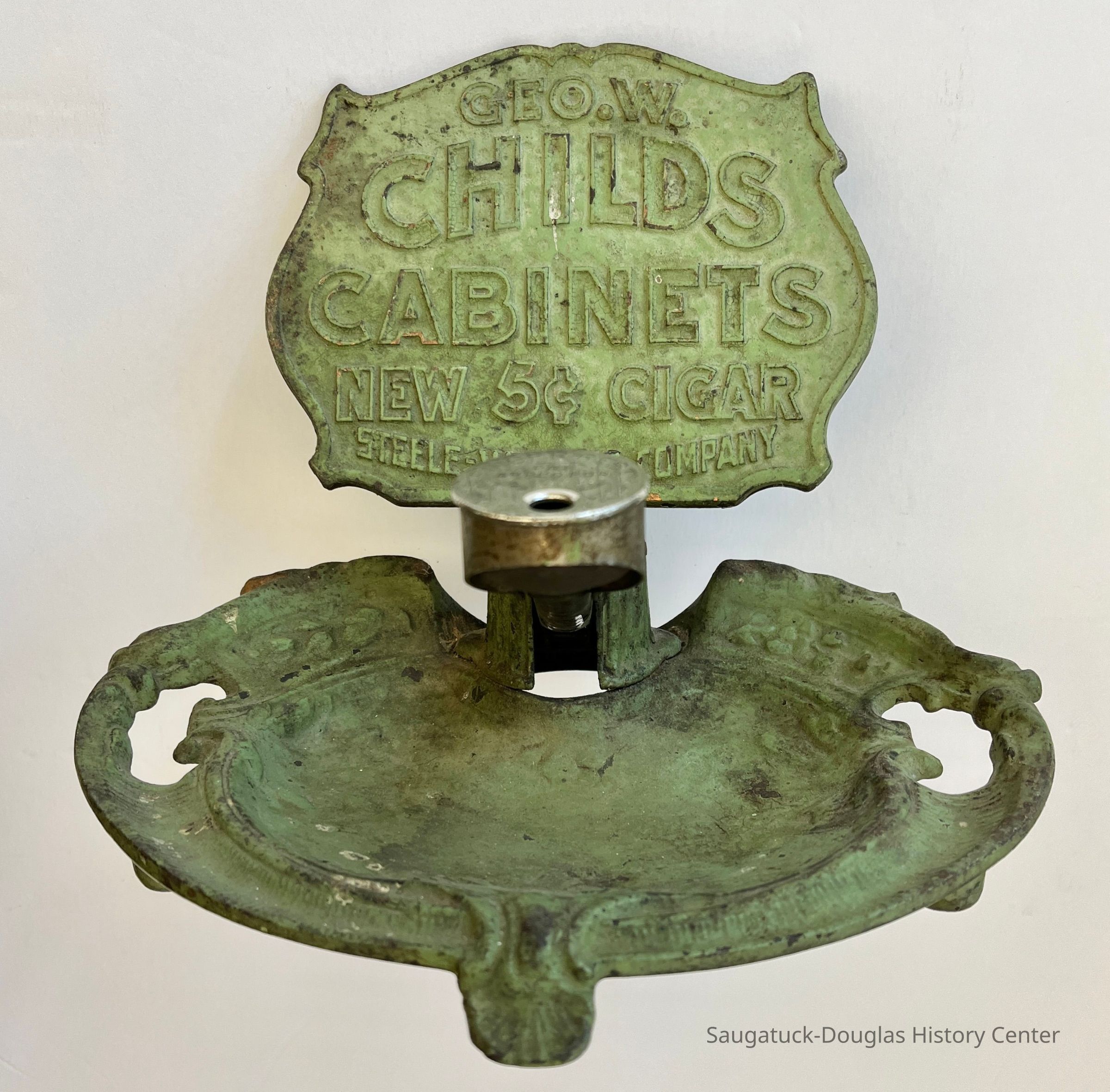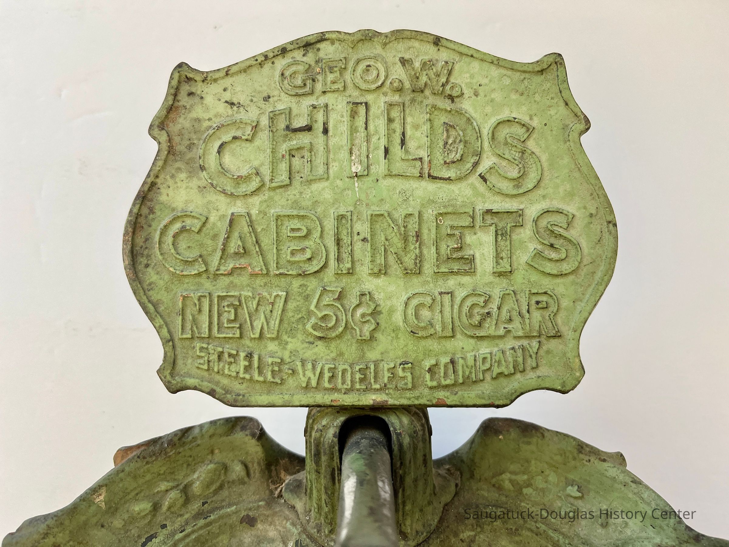 Green-patina, cast metal cigarillo tip trimmer and ashtray with branded plate that displays the text "George. W. Childs Cabinets New 5 Cent Cigar / Steele-Wedeles Company".
