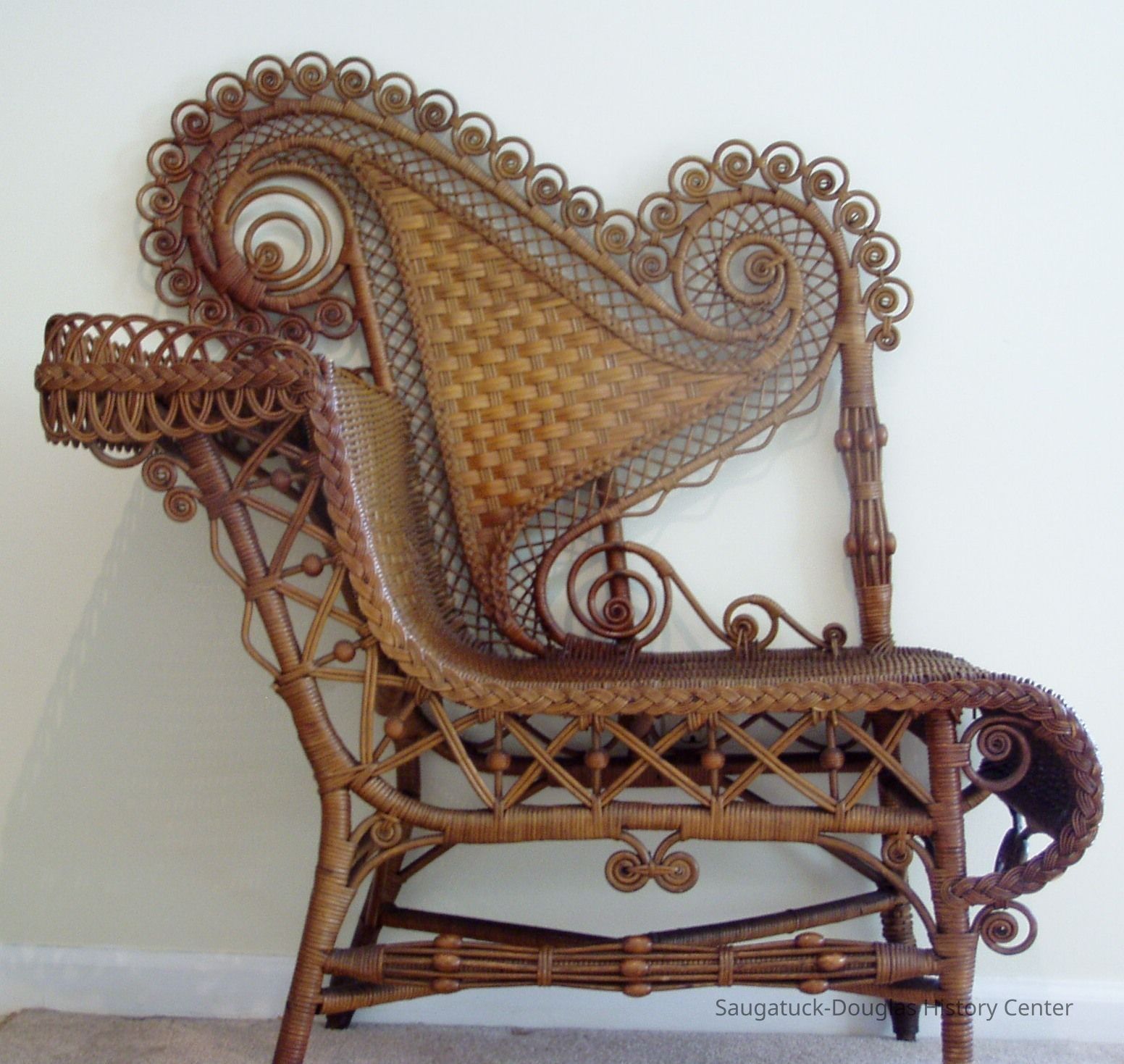 Mr Baker is seated in an elaborate wicker chair with a single armrest. Mrs. Baker stands beside him.