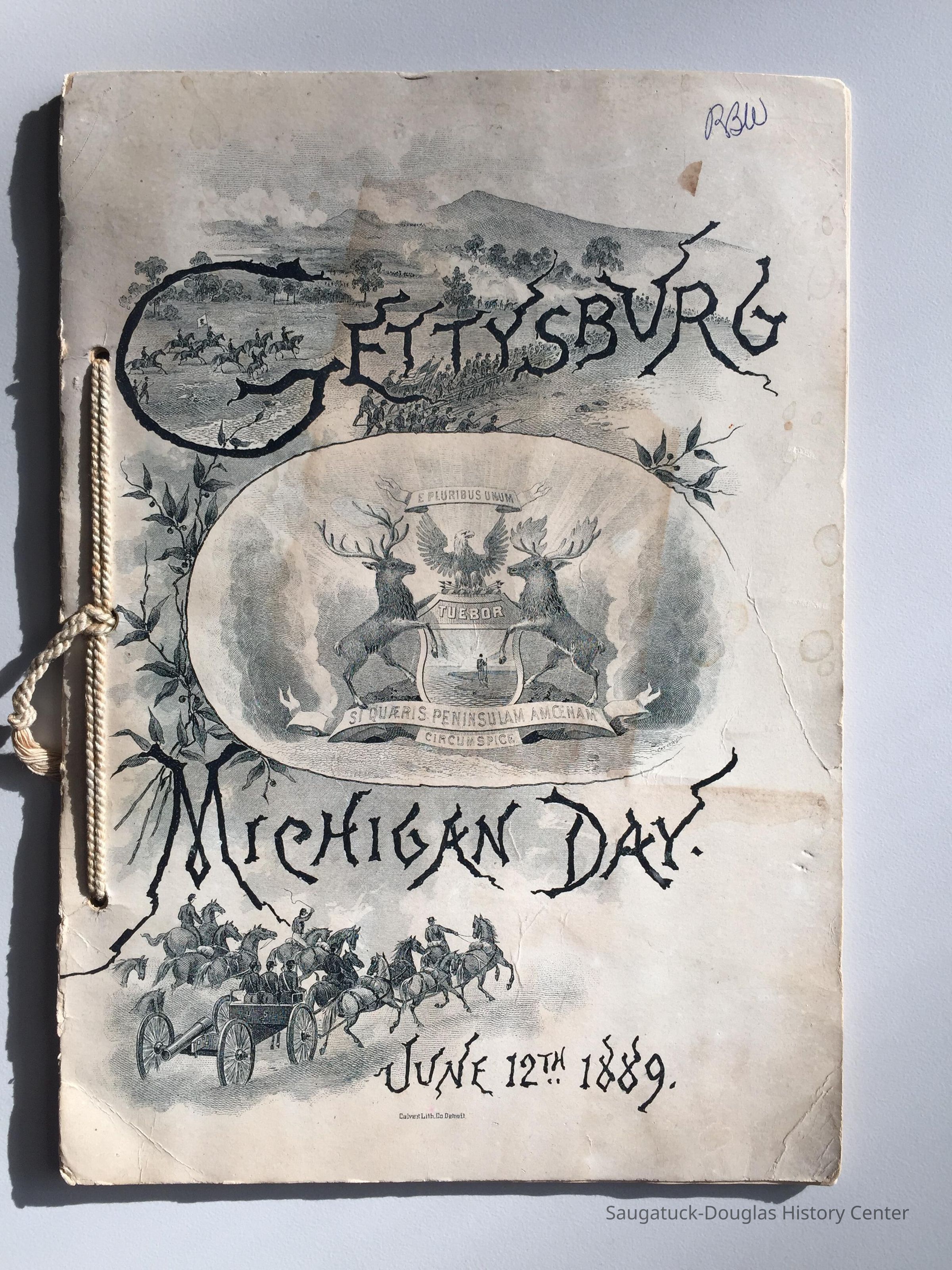 Cord bound booklet with monument photos, inscriptions and general information about Michigan troops in the Civil War. "RBW" is written in pen on the upper corner of a cover that features an illustration of cavalry and soldiers surrounding the Tuebor crest of the state of Michigan.