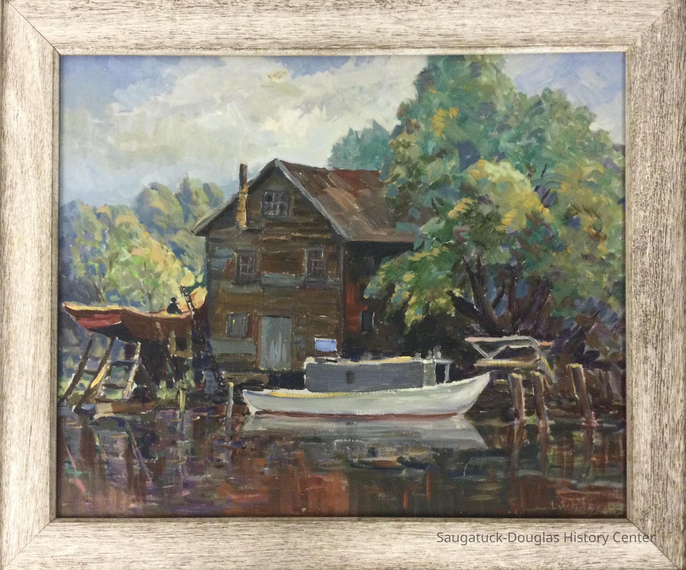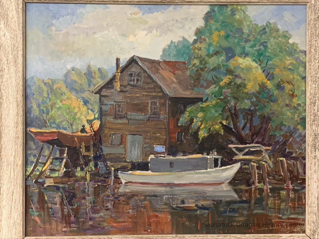 The Gleason Fish House, the subject of this painting, stood on the bank of the Kalamazoo River on the Saugatuck waterfront.
