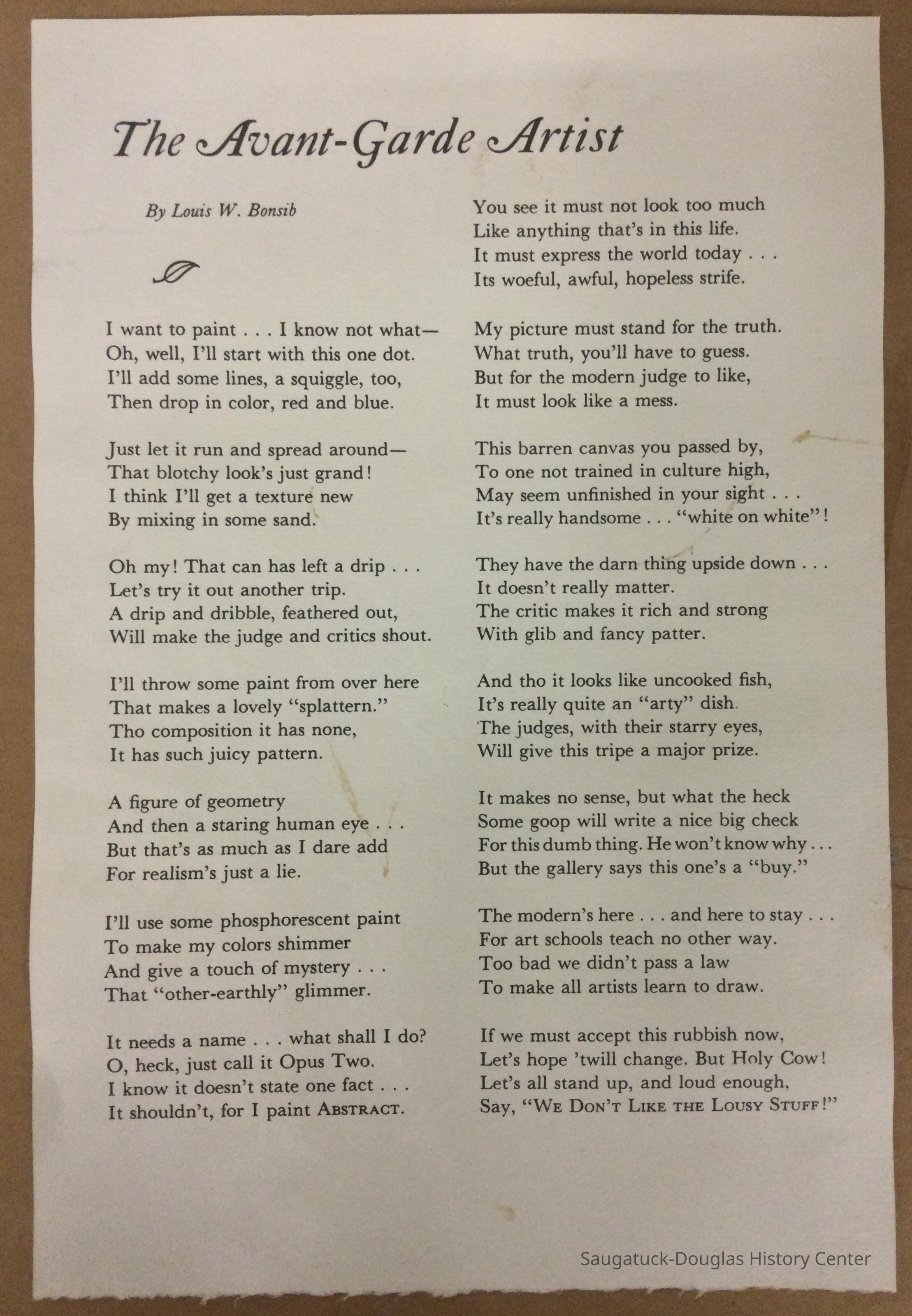 Oil painting of the Gleason fish house in Saugatuck. On the back there is a snippet dedicated to Louis Bonsib’s connection to the Northwest Territory Art Guild as well as a poem by Bonsib, the artist.Type of Painting