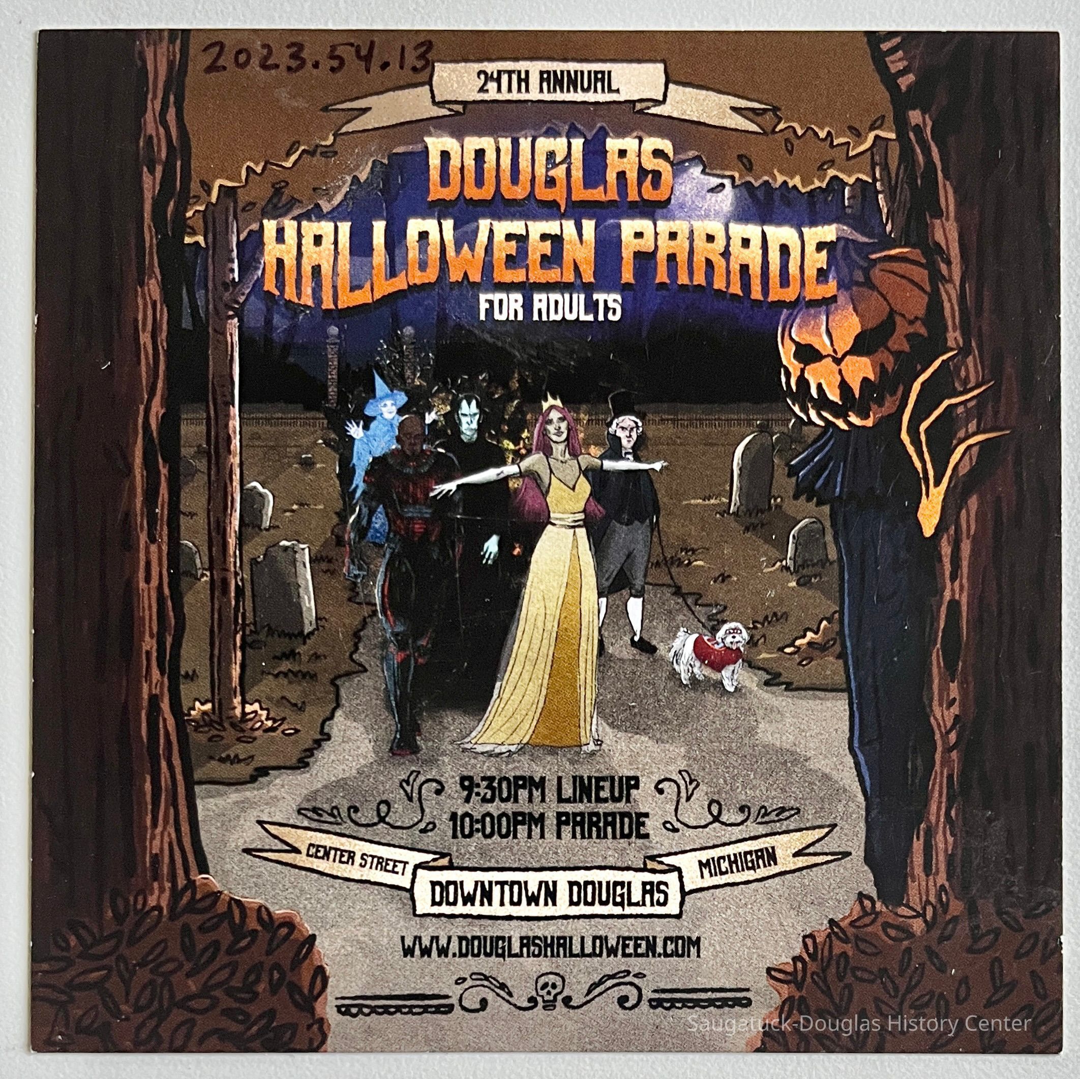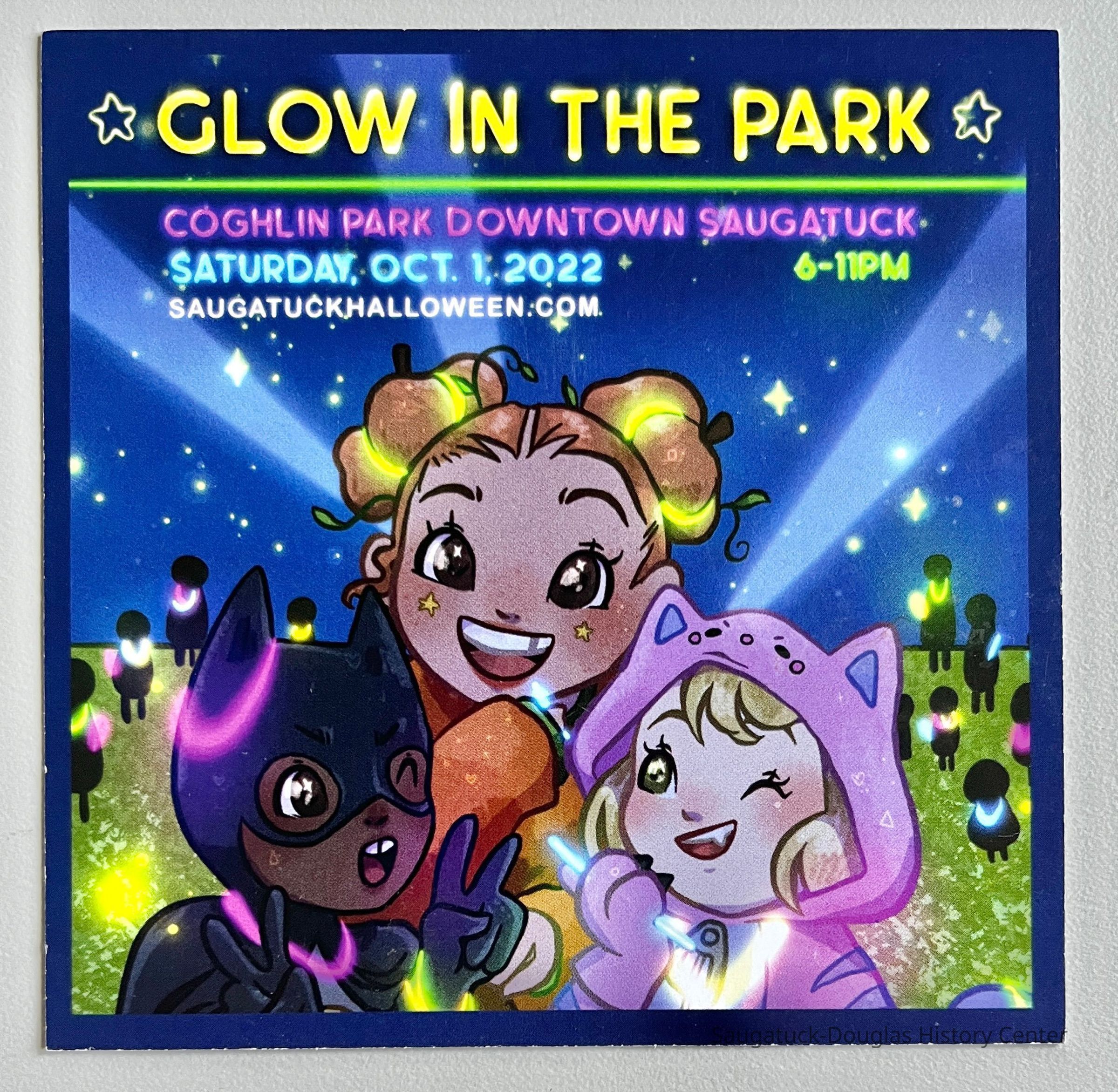 Card promoting Glow in the Park, a family event at Saugatuck's Coghlin Park and the 24th annual Douglas Halloween Parade in 2022. The card has illustrations of a trio of anime-style children enjoying the Glow on one side and, on the other side, a woman in a yellow gown leading costumed adults to where the Pumpkin King lurks behind a tree.Context