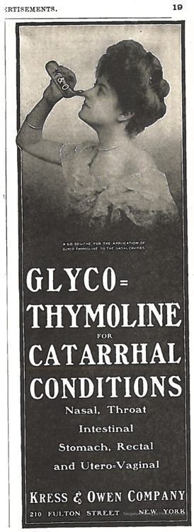 "Glyco-Thymoline was developed as a mouthwash by pharmacists Samuel Owen and Oscar Kress in the 1890's. Throughout the twentieth century it was promoted widely to treat mouth and skin irritations. For an eyewash, 10 to 30 drops of Glyco-Thymoline were diluted in warm water in the eye bath."