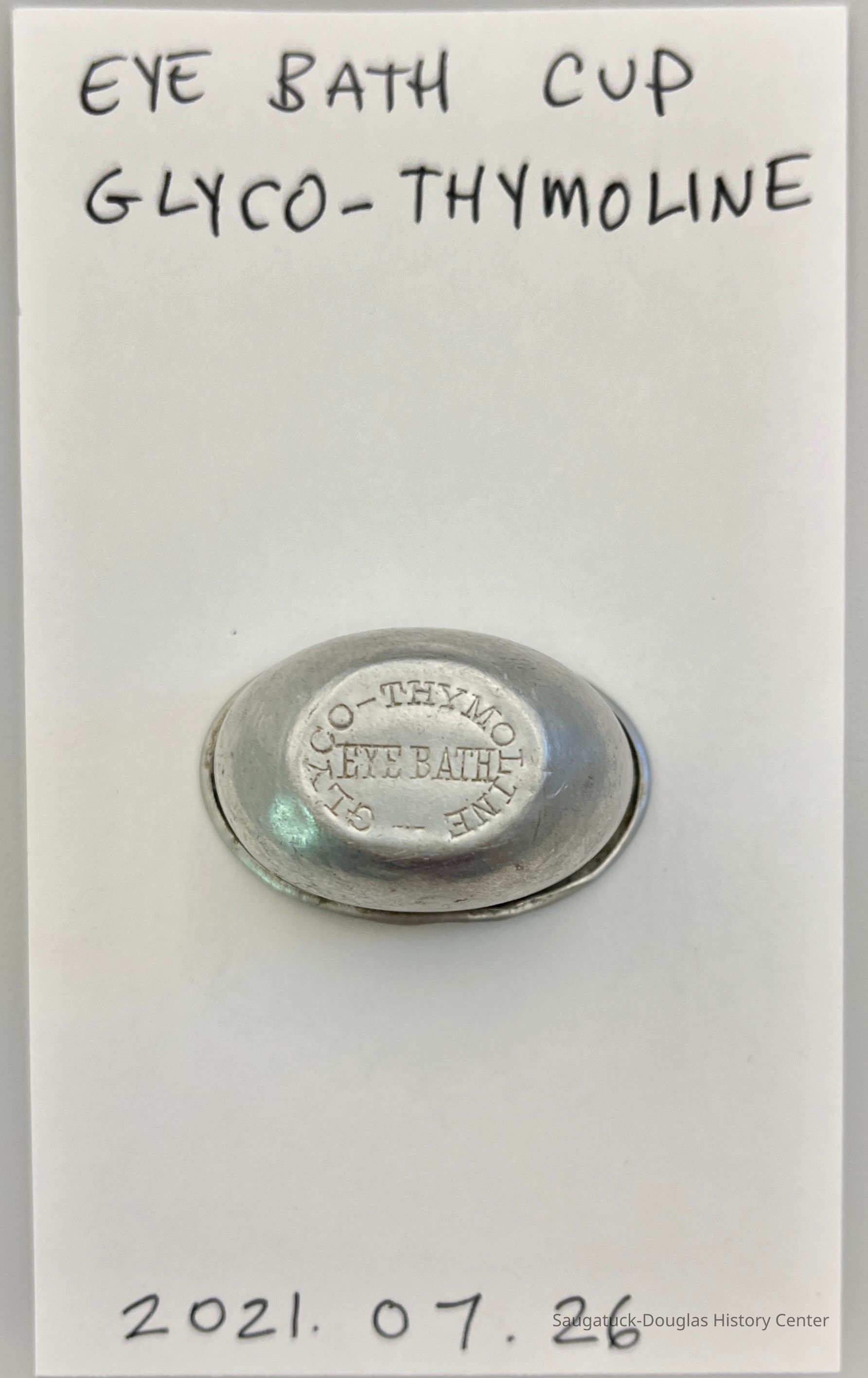 An oval metal cup with rolled edge and the engraving "GLYCO-THYMOLINE" and "EYE BATH" on the bottom.Context