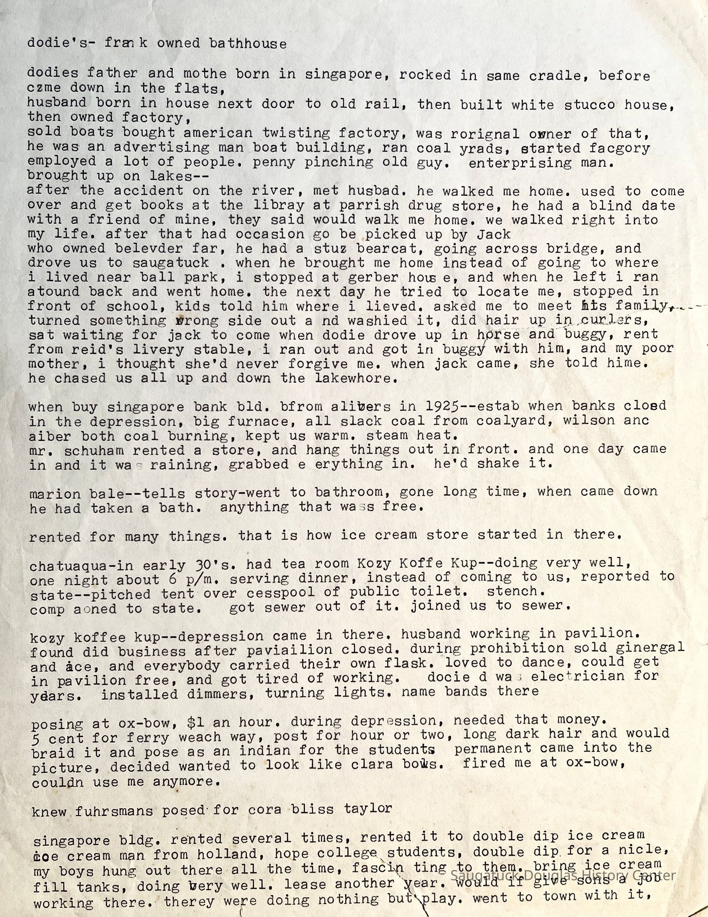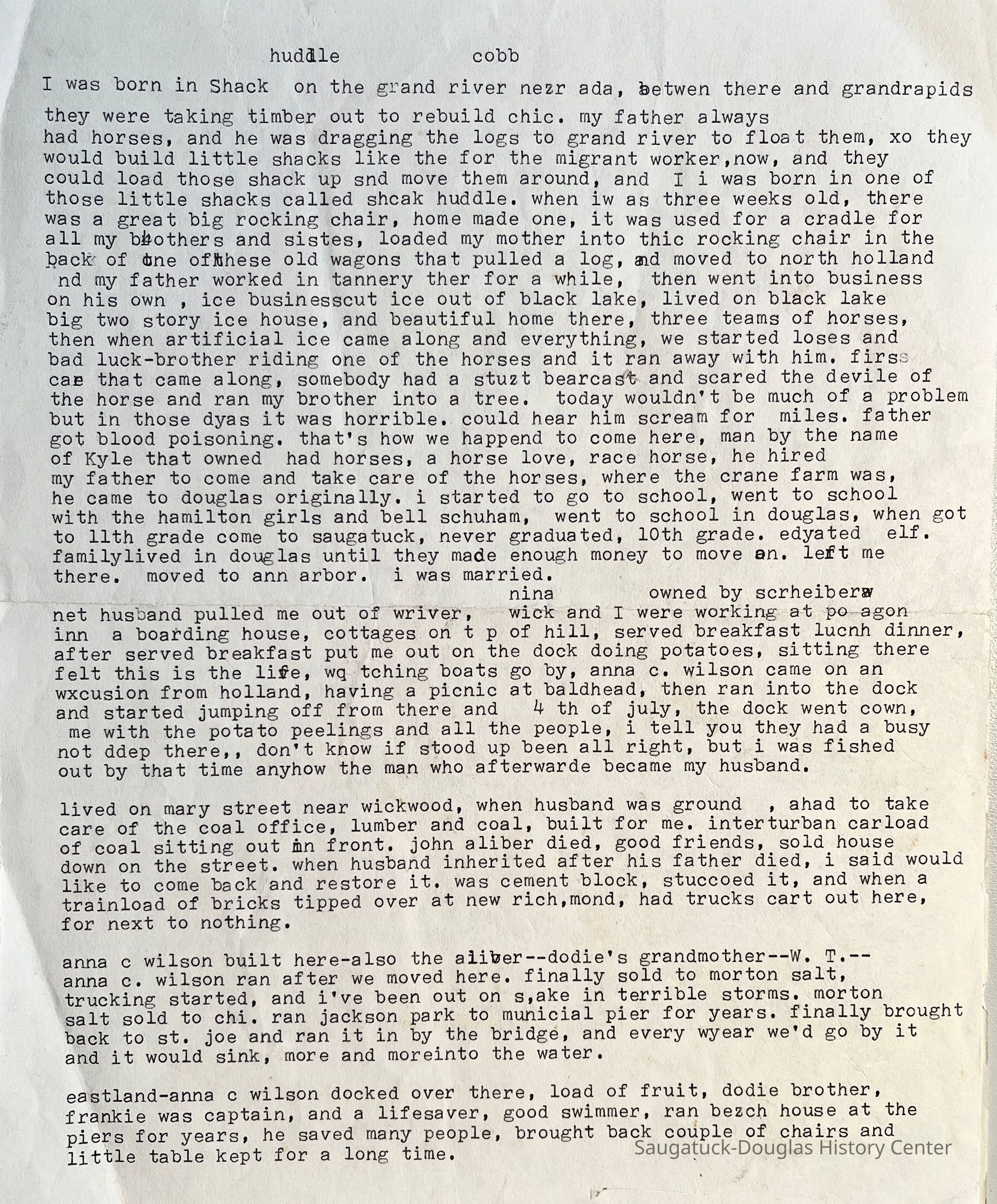 The interview notes begin with the Grace Cobb being born at Shackhuddle on the Grand River near Ada, Michigan. He father worked dragging logs with horses, later at a tannery in Holland, and still later cutting ice out of Black Lake... until refrigeration was invented. After a mishap with her brother and horses, the father was invited by a man named Kyle to care for horses "where the Crane Farm was". Grace went to school with the Hamilton girls and Belle Schuham in Douglas and switched to the Saugatuck school for 11th grade but never graduated. The family moved to Ann Arbor but she remained in Douglas.
