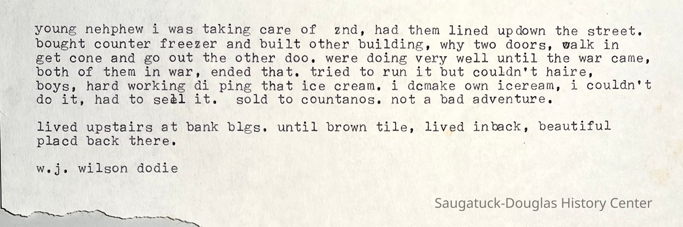 3. Two and a half pages of typewritten notes, possibly by Mike Sweeney. The eccentric text is unsigned but the subject is Grace (Cobb) Wilson, spouse of William "Dodie" Wilson. Grace Wilson was the president of the Saugatuck Women's Club and supported the Community Hospital. She and her husband ran the Wilson Coal Company, the Kozy Koffe Cup, Wilson's Cone Shop, and the American Twisting Company. See "context" for highlights description.Context