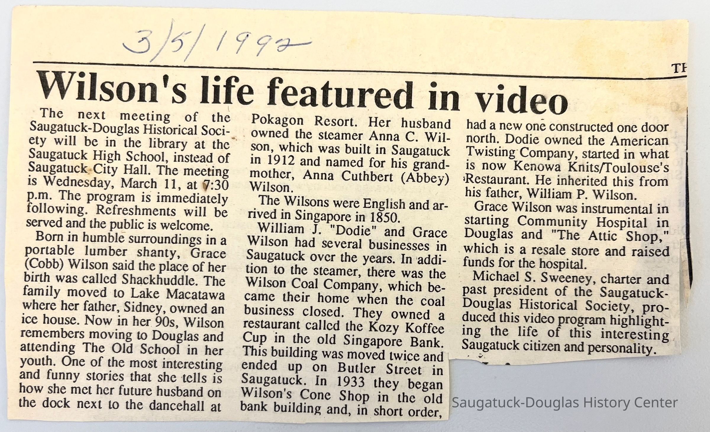 2. Photo of 5 Mar 1992 Commercial Record newspaper clipping about presentation of the video program at a meeting of the Saugatuck-Douglas Historical Society.