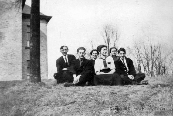 This image was featured as History Mystery #20 with the question "This photo is from a Pfaff family album. The Saugatuck School is in the background. What class was this and can you identify any of the members?" and the solution "We believe this is the Saugatuck High School class of 1913. The members have not been identified."Photograph Details