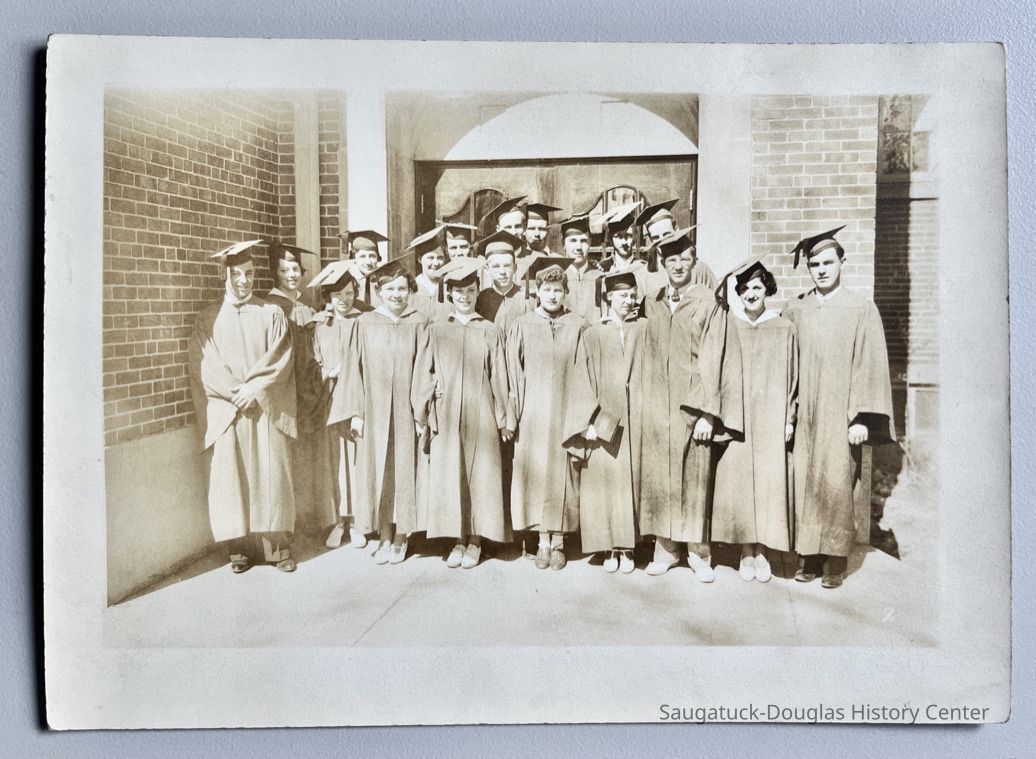 A group of about 19 graduates pose with caps and gowns outside a brick building which is presumed to be the Saugatuck High School.