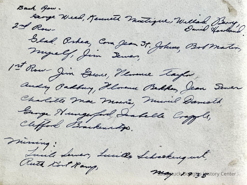 Jim Greene?, Florence Taylor, Audry Paddery?, Florence Bekken, Jean Sewer. Charolotte Mac Morris, Muriel Damoth, George Hungerford, Isabelle Crapple?, Clifford Brackenridge