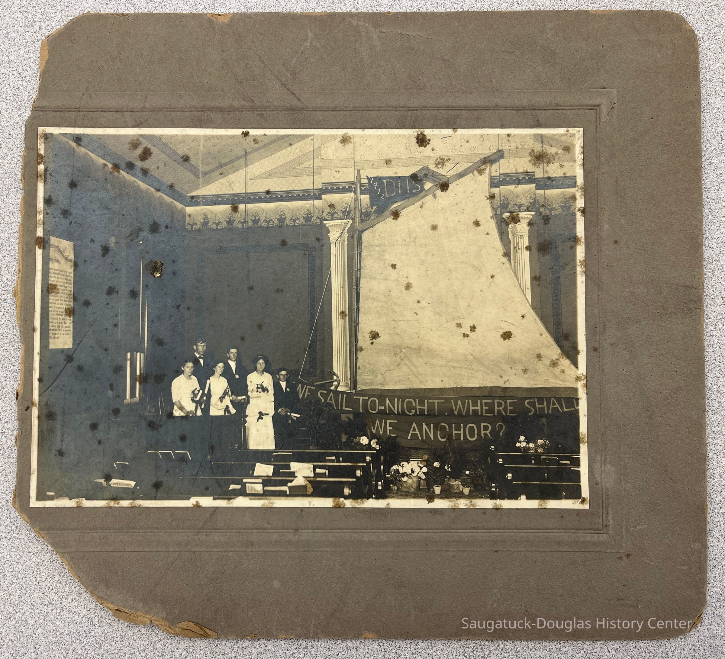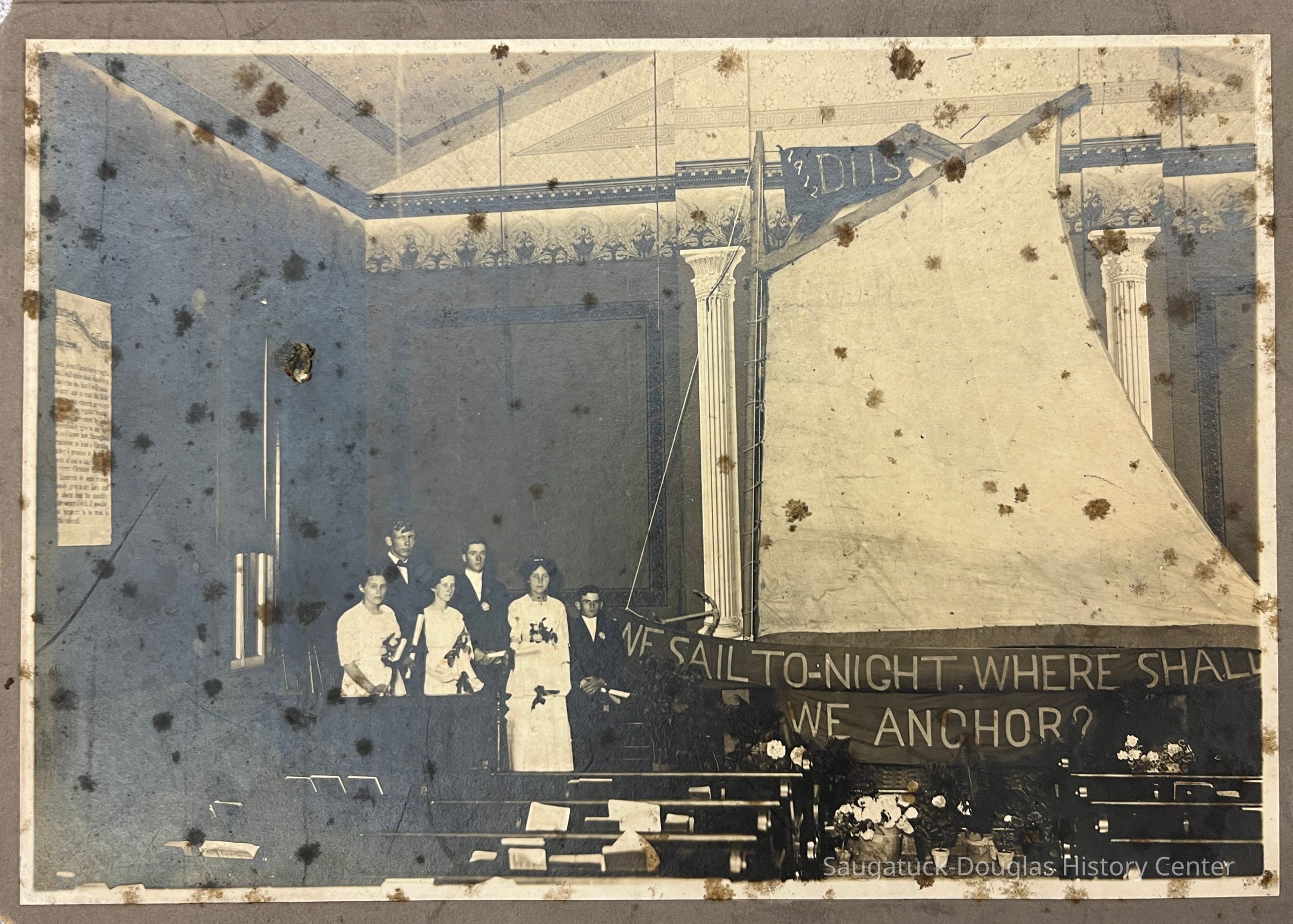 Six student of the graduating class of 1912 DHS (unknown) at the front of a church or auditorium next to a sailboat with a banner reading "We Sail To-Night, Where Shall We Anchor?"Photograph Details