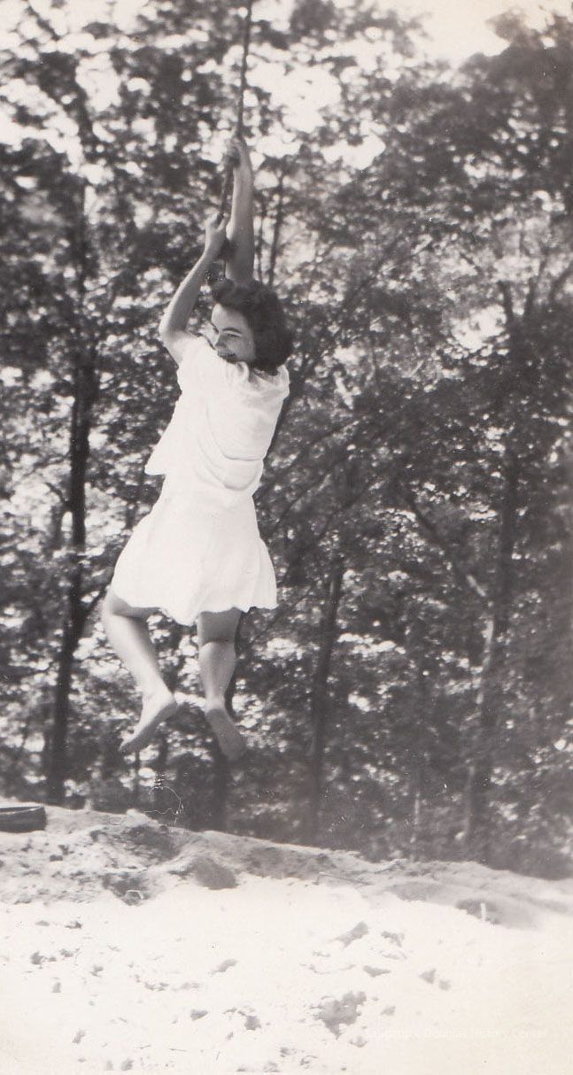 From then on, a favorite project each summer was to search for a well-located grapevine and ready it for takeoff. Sometimes scratchy bushes and saplings that stood in the flight path had to be eliminated. It took serious exploration to find one that could be made into a desirable swing, and some summers we were more successful than others. None was, unfortunately, any good the next year, as the dead vine lost its grip on the parent tree and a a risk taker might boldly launch, only to be gently let down as the canopied tangle gave bit by bit.