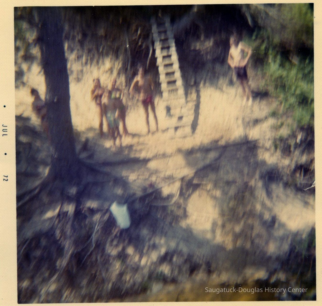 In later, environmentally conscious, days the grapevine was replaced by a thick rope that hung from a bent tree over the sand path down the south side of Baldhead. The rope was in place into the 1980's. Some said it was a rope salvaged from "The Swinging Tree," a tall tree that leaned out over the Kalamazoo River from the west bank about a half mile downriver from Willow Park permitting swingers to drop into the river below at the height of their wide arc. Dick and Deb Hoffman who ran the Island Queen excursion boat tended the rope and it appears on one of Debbie's tourist maps. The tree to which the riverside rope was attached toppled in high water about 1976.Collection