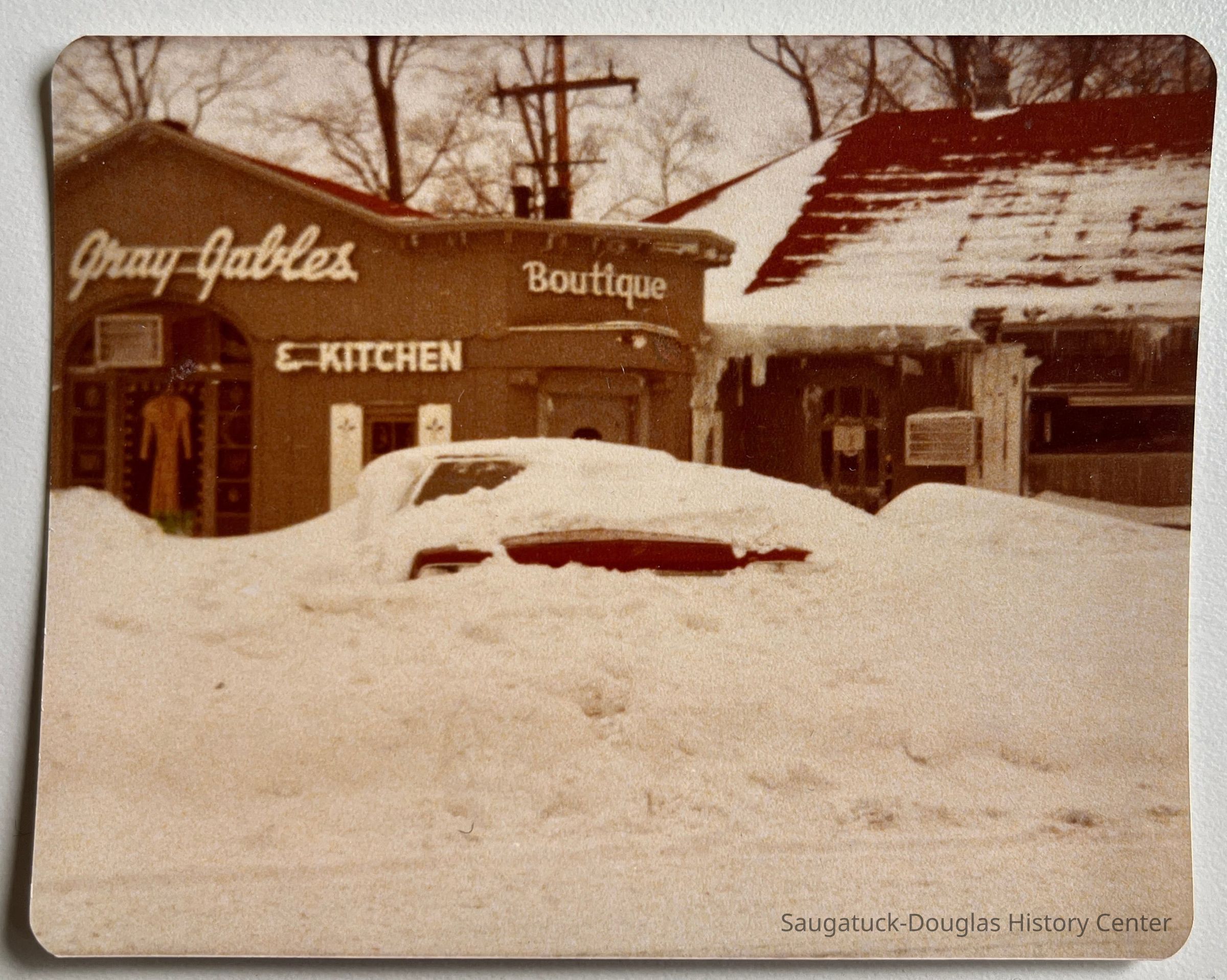 Color photo of the Gray Gables boutique and kitchen after an impressive snow fall. Two cars are almost buried in snow. Timestamp on the back of the photo is Jun 78.Photograph Details