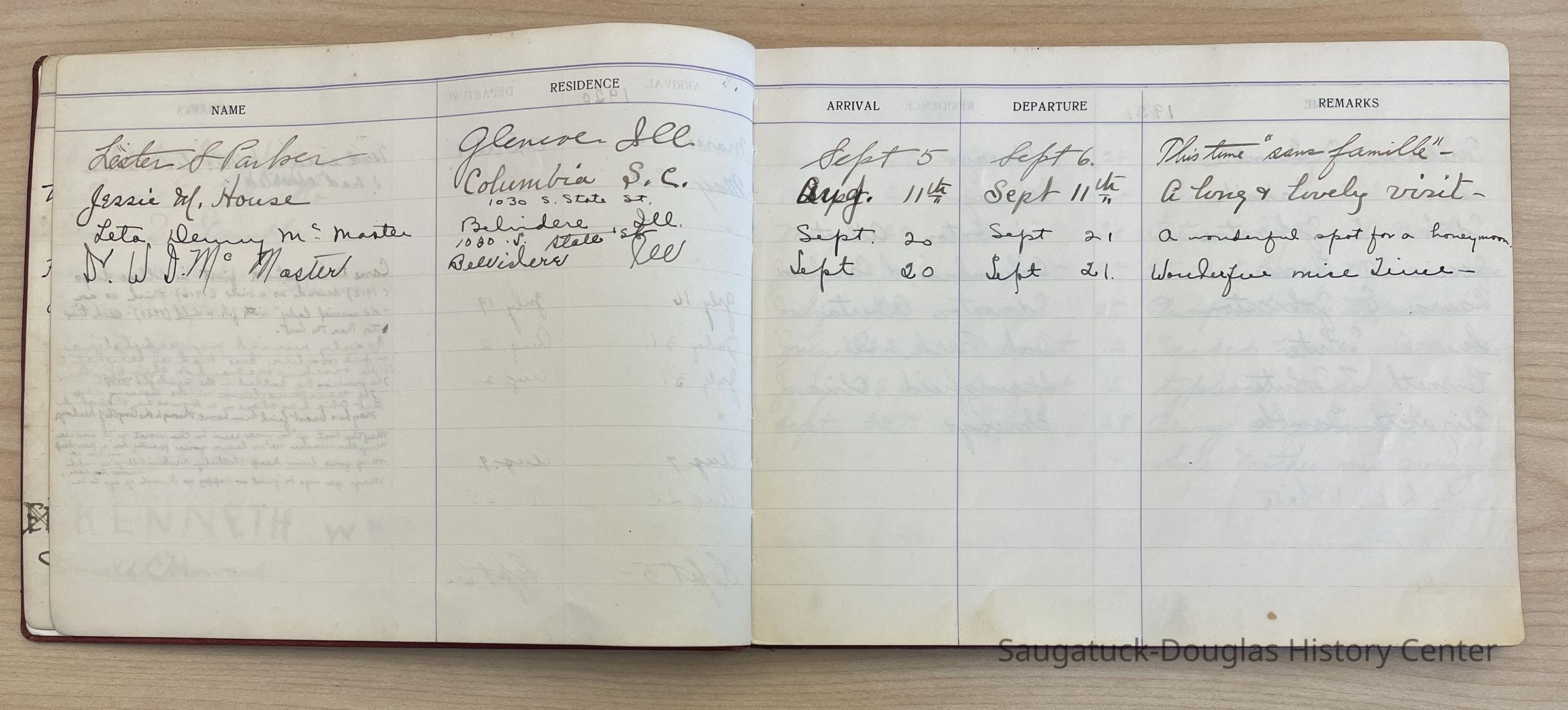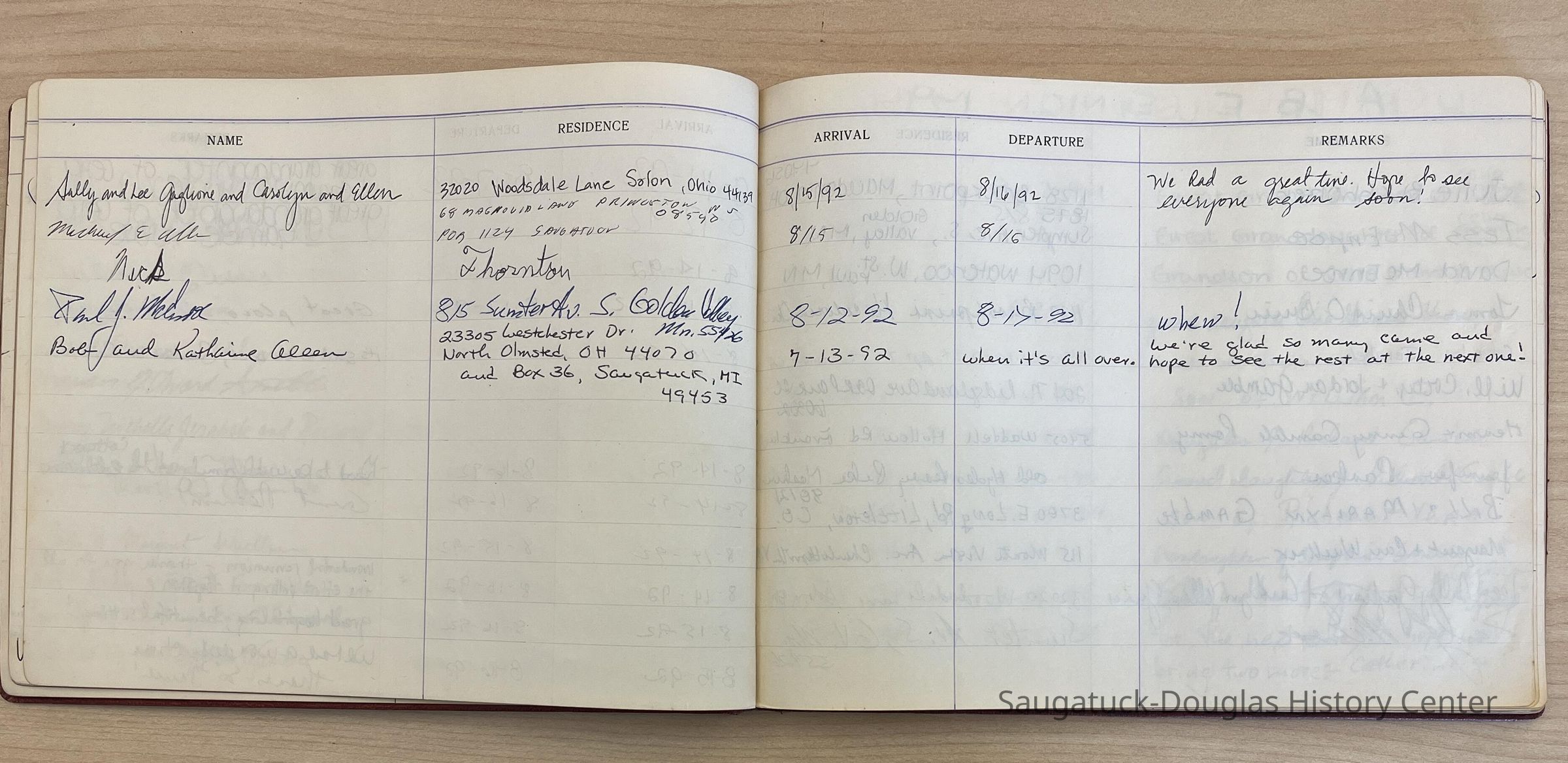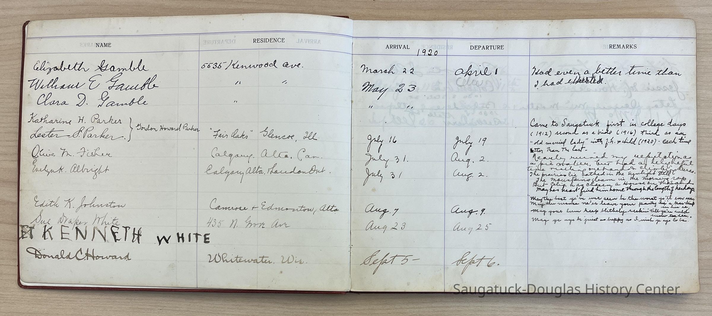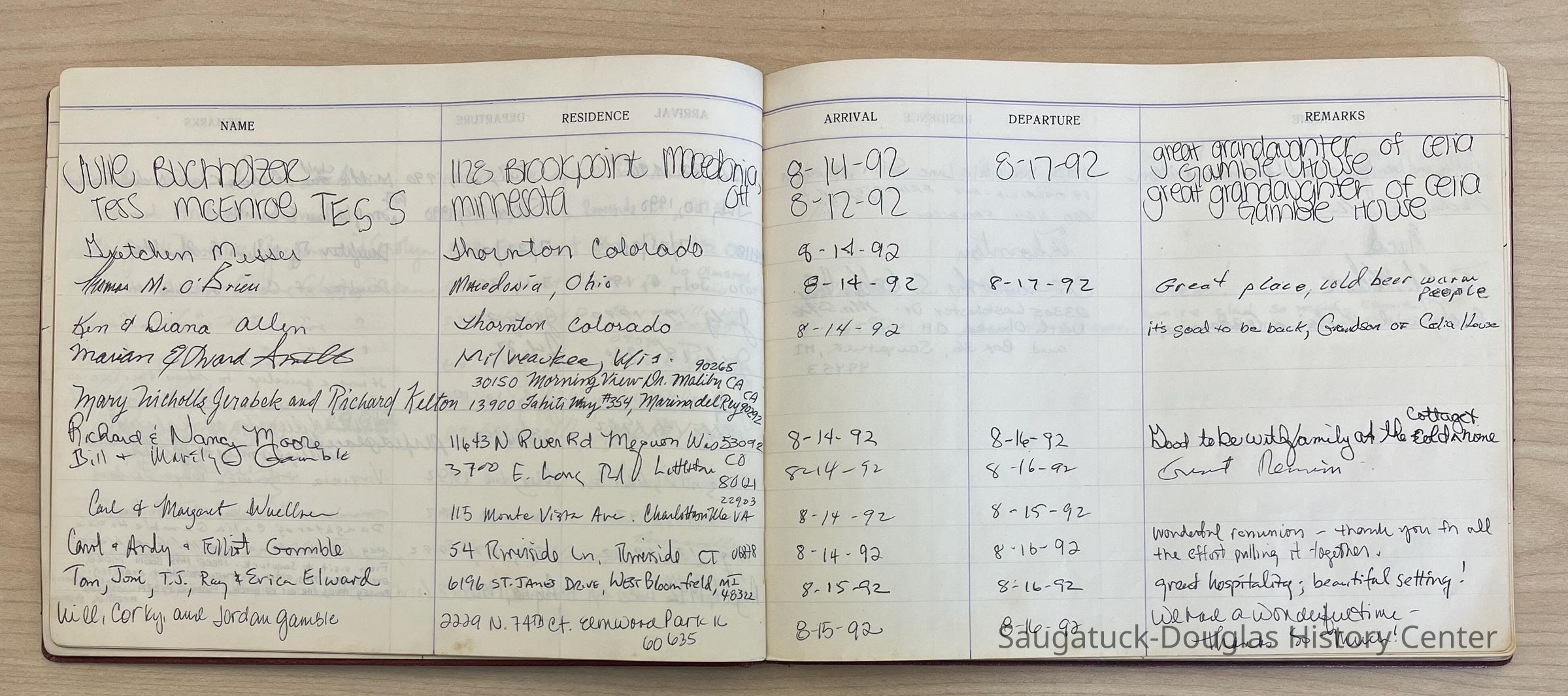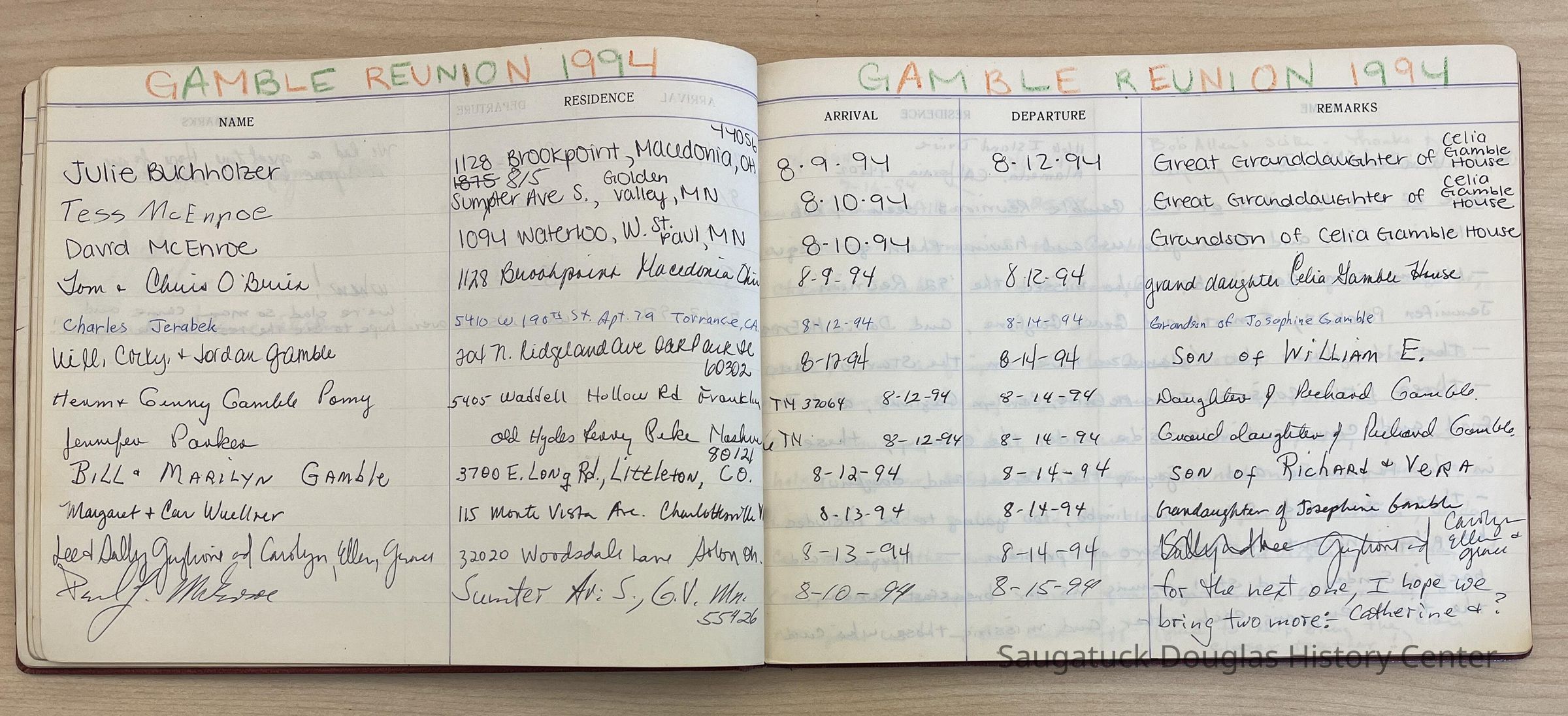 Guestbook used by the House and Gamble family to record the names, addresses, arrival/departure dates, and impression of visitors from 1920s to the Gamble family reunion in 1994.