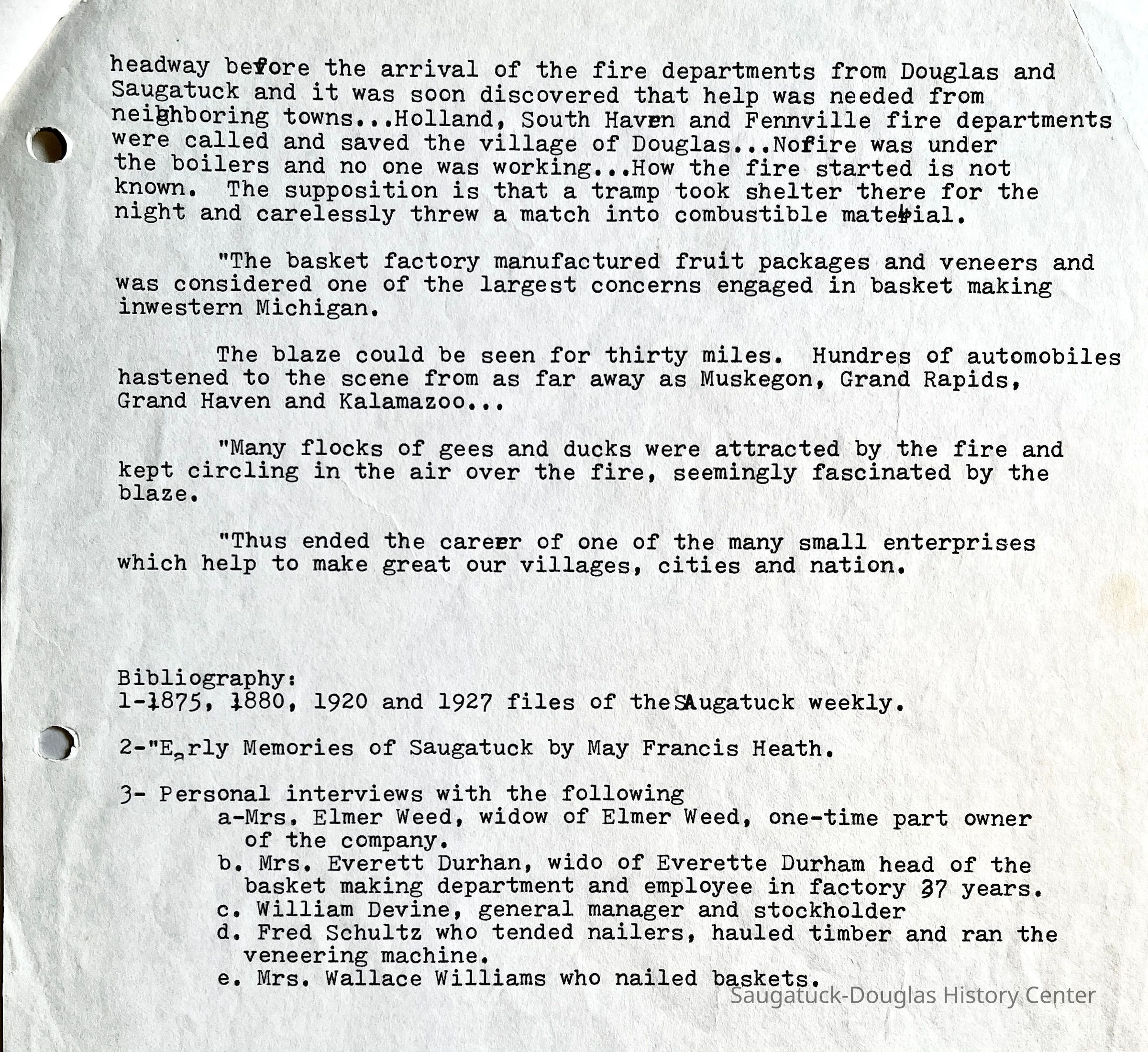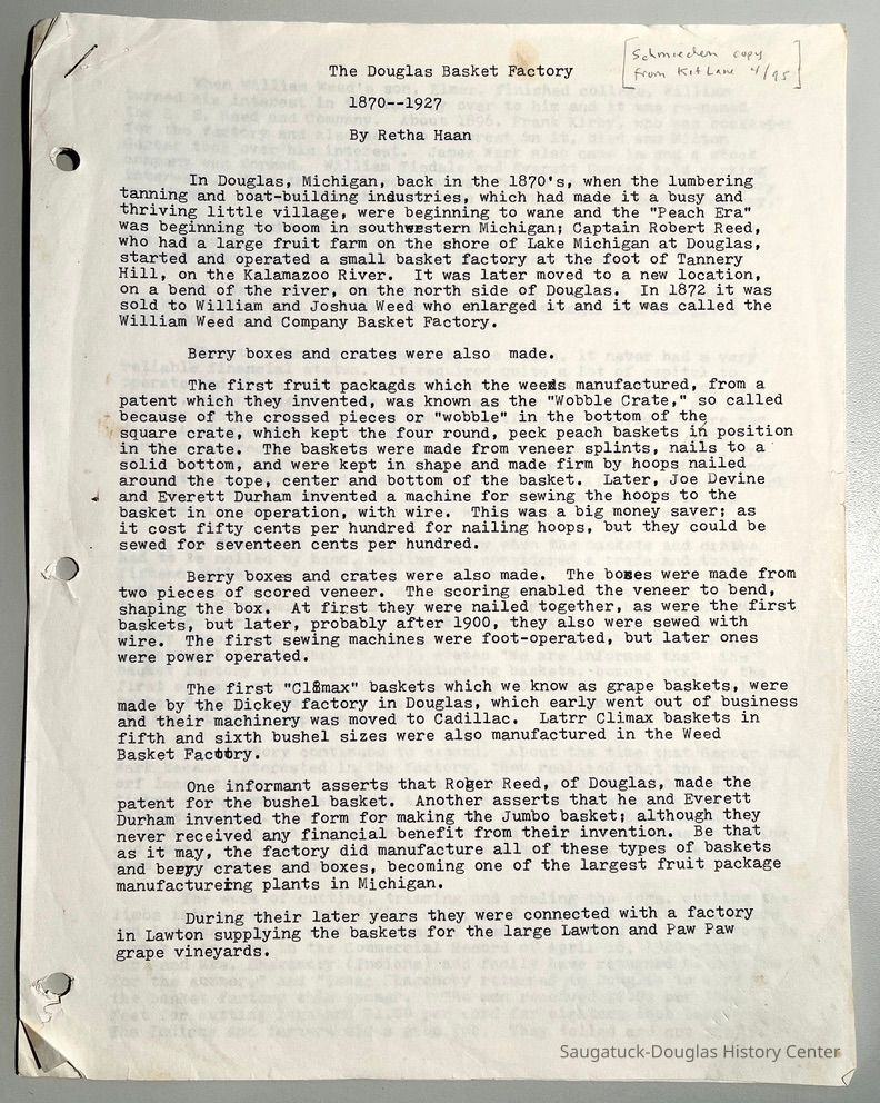 In Douglas, Michigan, back in the 1870s when the lumbering, tanning and boatbuilding industries which had made it a busy and thriving little village, were beginning to wane and the "Peach Era" was beginning to boom in southwestern Michigan, Captain Robert Reed, who had a large fruit farm on the shore of Lake Michigan at Douglas, started and operated a small basket factory at the foot of Tannery Hill on the Kalamazoo River. The operation was later moved to a new location, on a bend of the river, on the north side of Douglas. In 1 872 it was sold to William and Joshua Weed who enlarged it and it was called the "William Weed and Company Basket Factory."