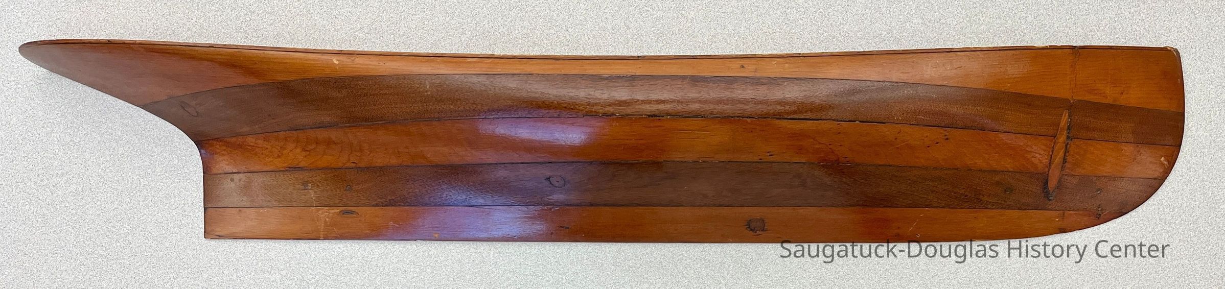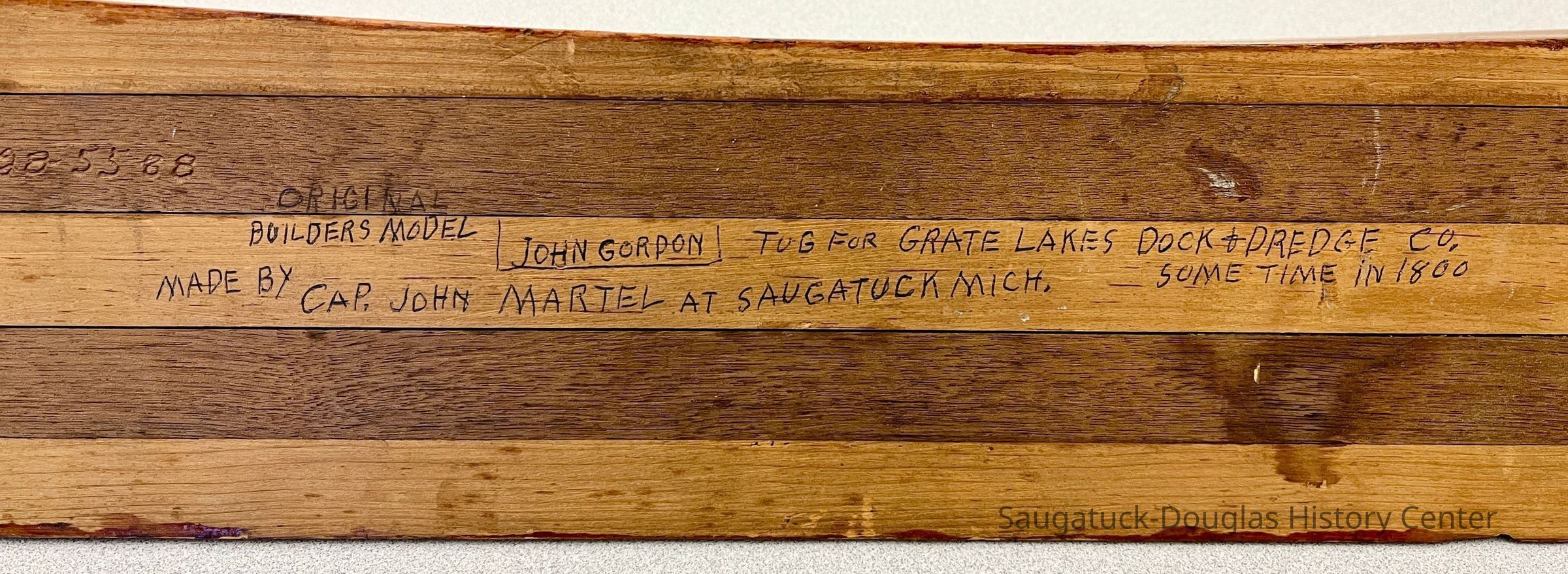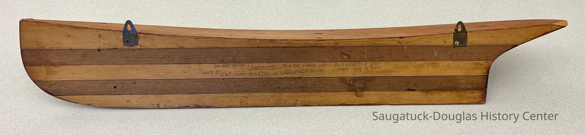 Wooden half-hull ship model for a tug [towboat] named "John Gordon." The model is constructed of slabs of wood. The front is polished to a smooth finish. The back of the model, which includes metal wall hangers, is unfinished and includes notations about the boat and builder.Context