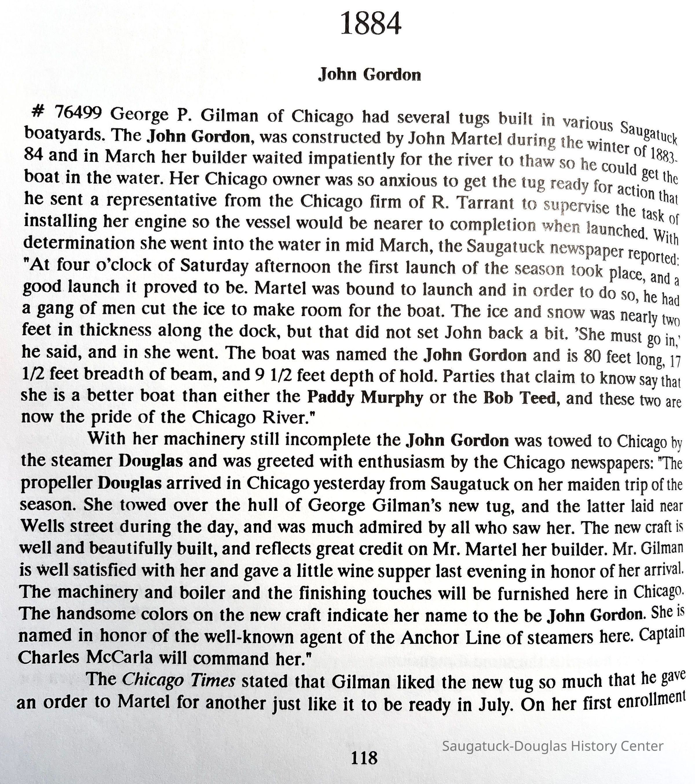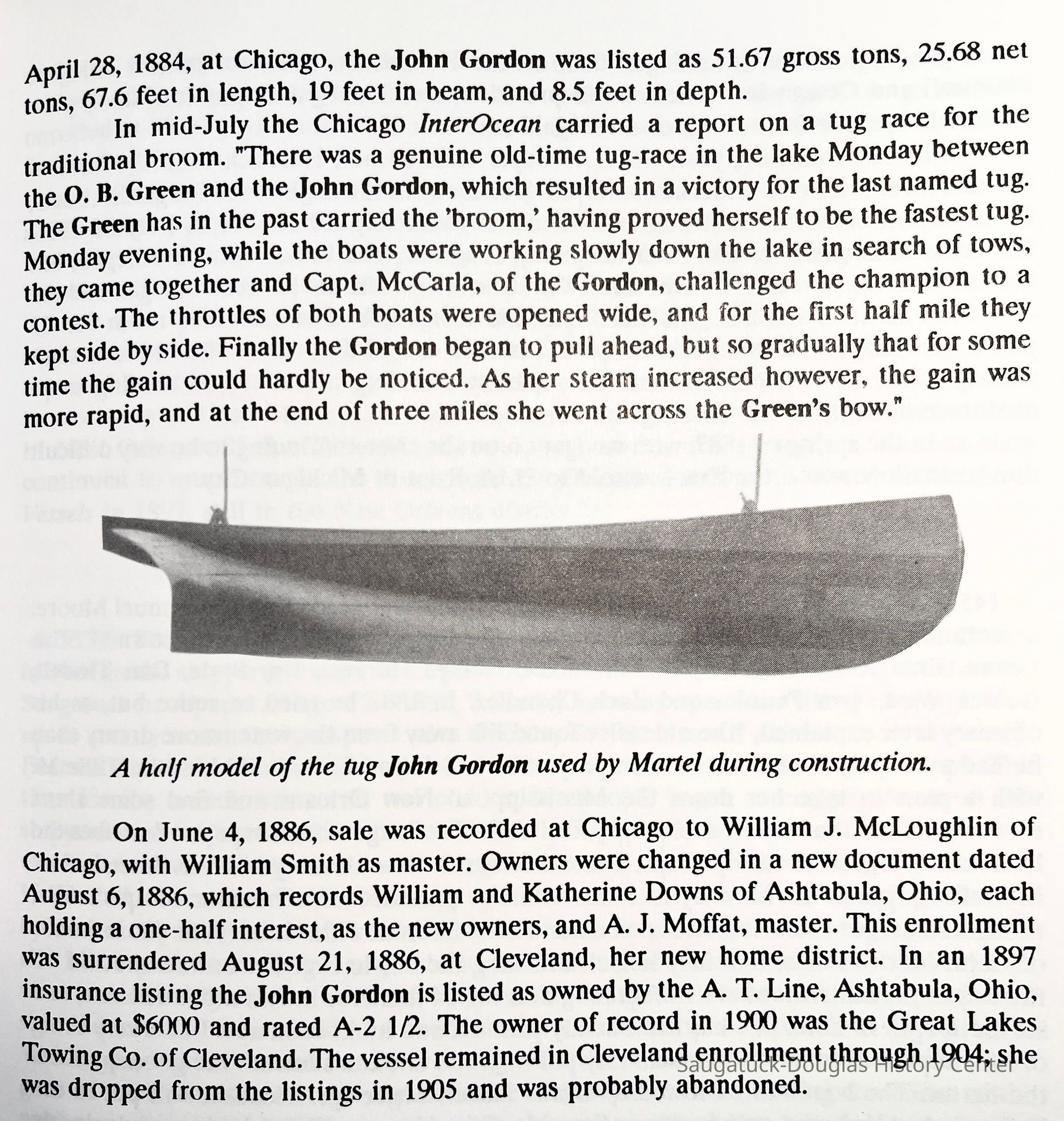 boatyards. The John Gordon, was constructed by John Martel during the winter of 1883-84 and in March her builder waited impatiently for the river to thaw so he could get the boat in the water. Her Chicago owner was so anxious to get the tug ready for action that he sent a representative from the Chicago firm of R. Tarrant to supervise the task of installing her engine so the vessel would be nearer to completion when launched. With determination she went into the water in mid March, the Saugatuck newspaper reported: "At four o'clock of Saturday afternoon the first launch of the season took place, and a good launch it proved to be. Martel was bound to launch and in order to do so, he had a gang of men cut the ice to make room for the boat. The ice and snow was nearly two feet in thickness along the dock, but that did not set John back a bit. 'She must go in,' he said, and in she went. The boat was named the John Gordon and is 80 feet long, 17 1/2 feet breadth of beam, and 9 1/2 feet depth of hold. Parties that claim to know say that she is a better boat than either the Paddy Murphy or the Bob Teed, and these two are now the pride of the Chicago River."