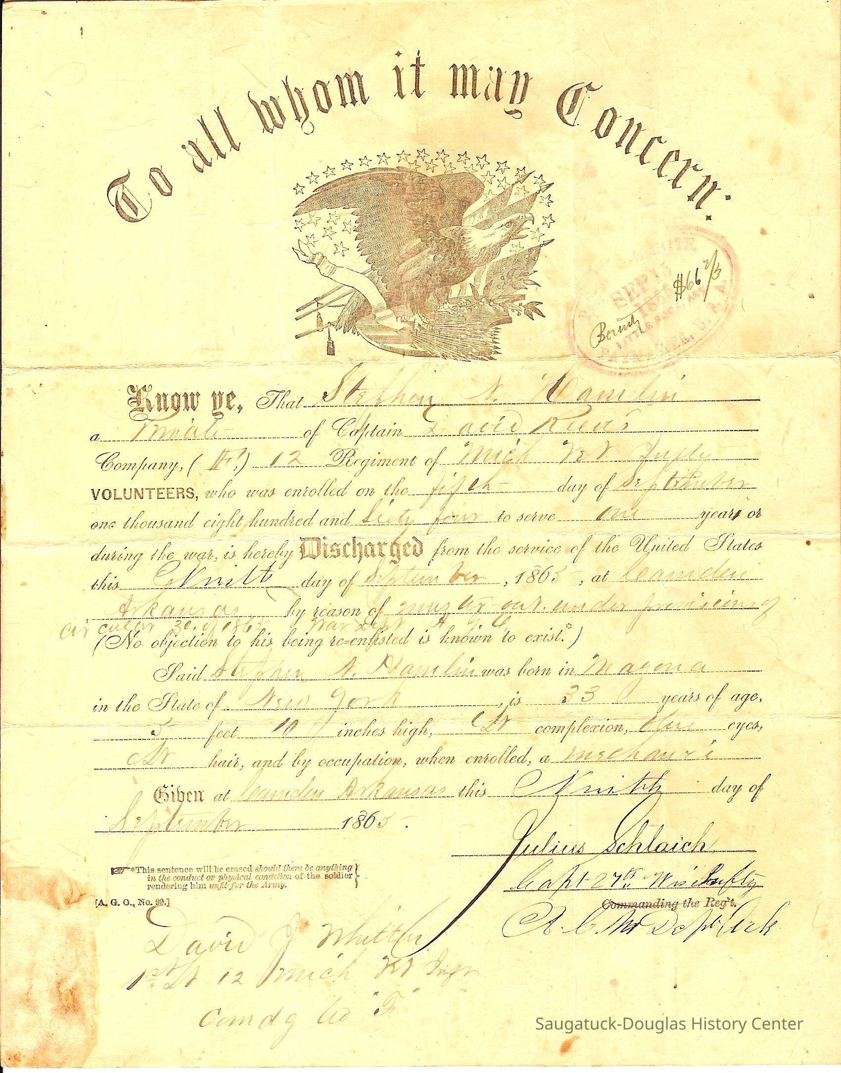 7. Stephen Marshall Hamlin Discharge - Civil War, digital scan