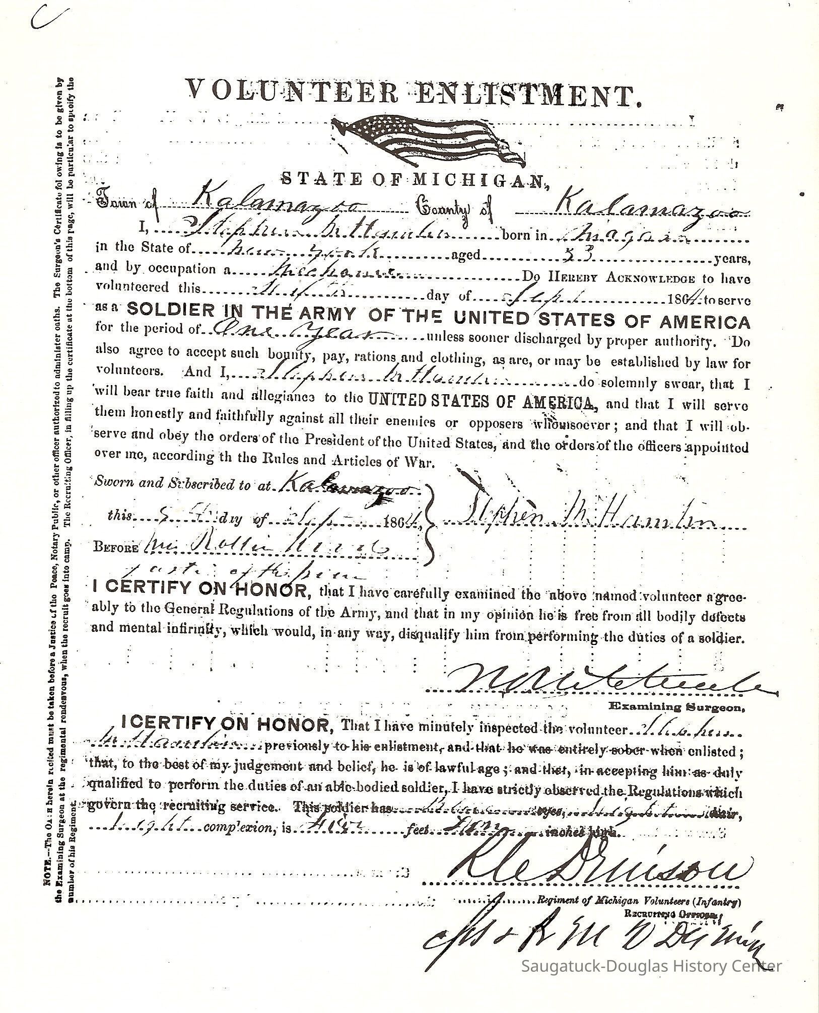 6. Stephen Marshall Hamlin Civil War enlistment document 1864, digital scan