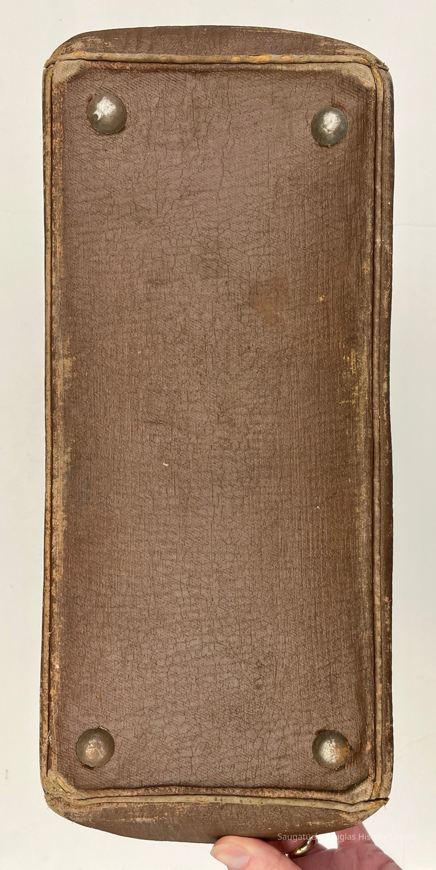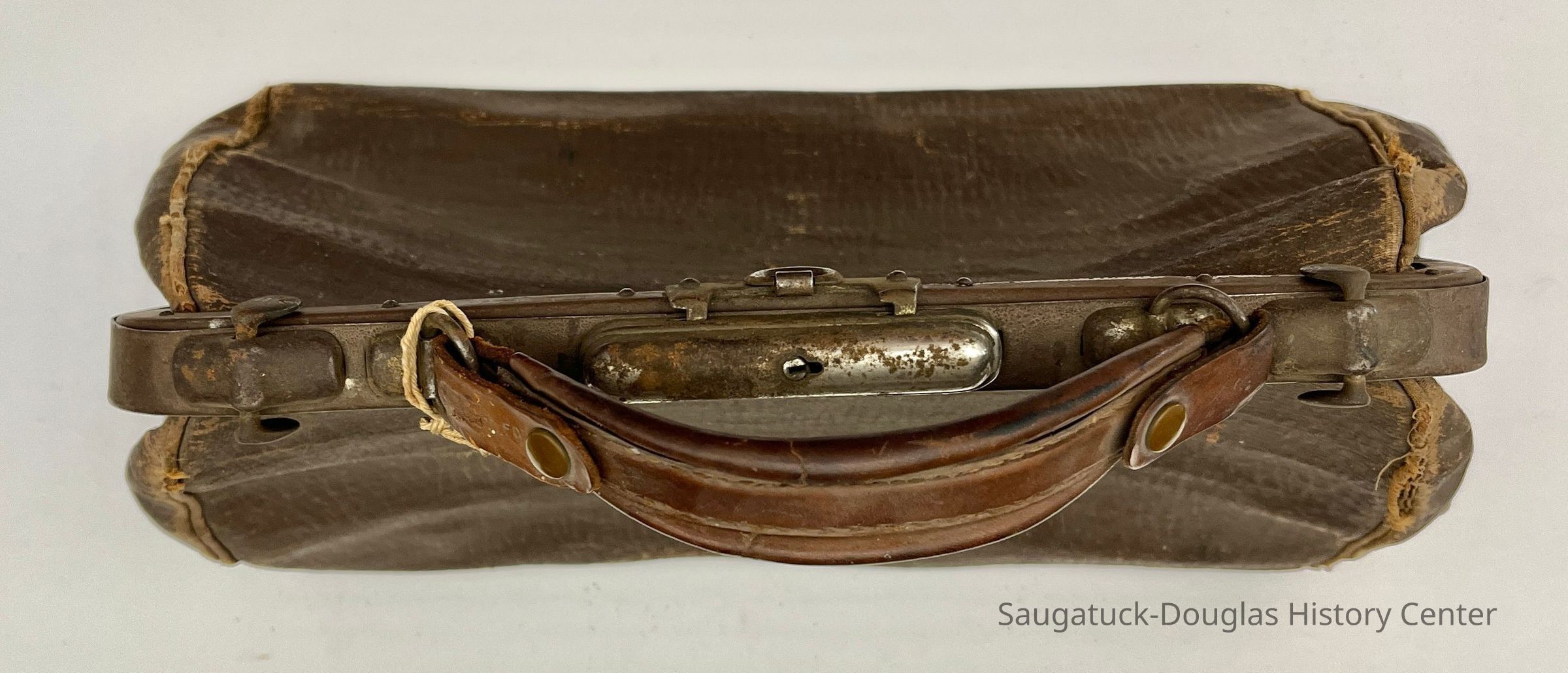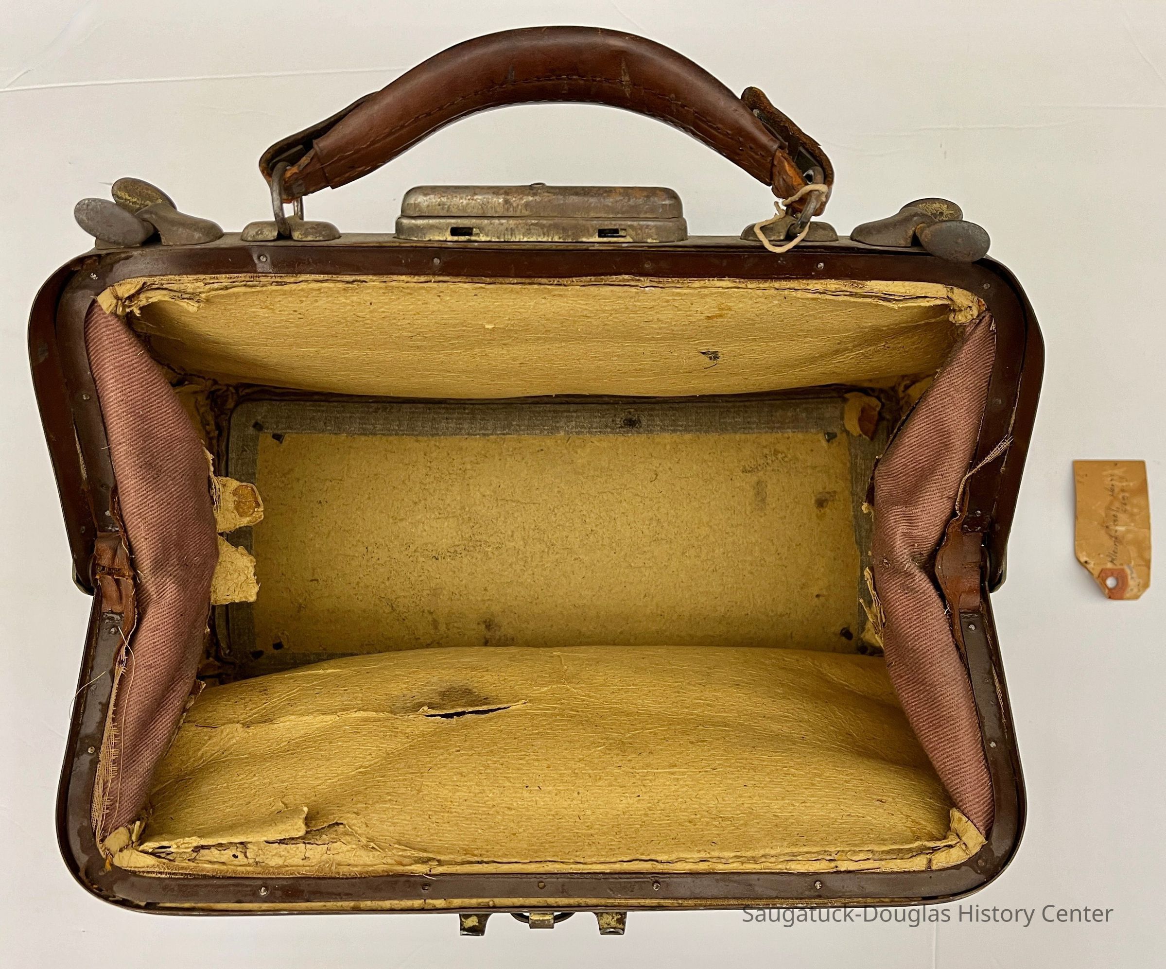 Bag A - Brown, coated-fabric bag with beige paperboard lining and metal clasp closure. The bag has a keyed, metal lock and double, swivel closures. A leather handle snaps on to two D-rings on the top of the bag. Four dome-shaped metal feet are attached to the bag's bottom. A paper tag was found inside the bag with the name "Kleinheksel, Ha???, 463943."